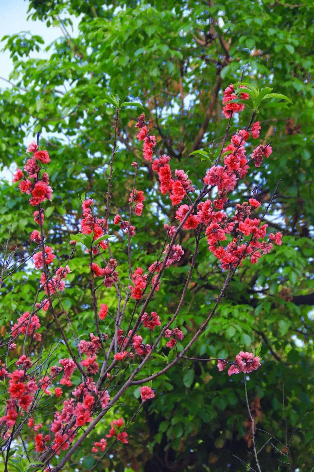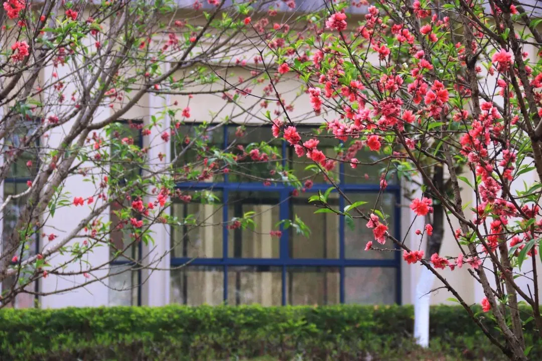 武2教学楼门口的碧桃,是我上课天天会经过的地方。之前赶课的时候,总看见满枝绯红,开得轰轰烈烈,却总想着“下次再拍”。等我今天特意骑着单车过来想留住它的样子,才发现盛花期已经过了,枝头只剩零星几朵,嫩绿的新叶已经悄悄冒了出来。