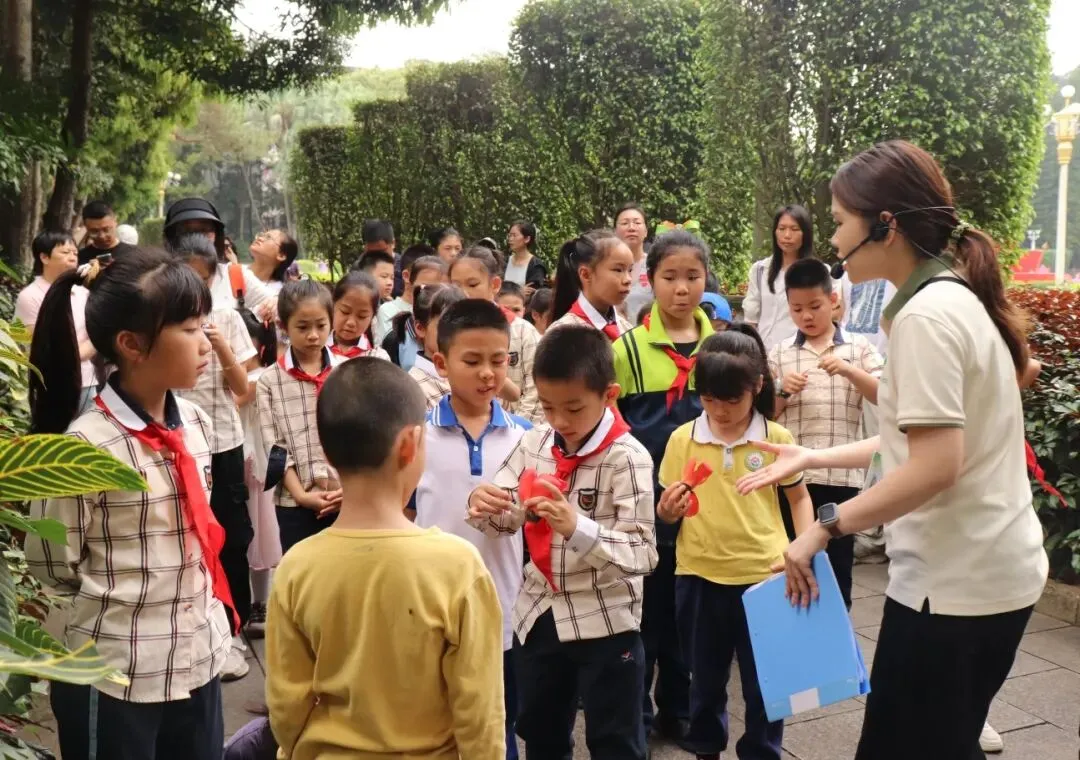 在英雄花课堂上,孩子们近距离观察木棉花实物,认真聆听讲解员讲述“花红如血、枝干挺拔”的象征意义。那一朵朵鲜红如炬的木棉花,仿佛在诉说着革命先烈不屈不挠的英雄气概,让孩子们深刻理解了英雄花与先烈精神的内在联系。