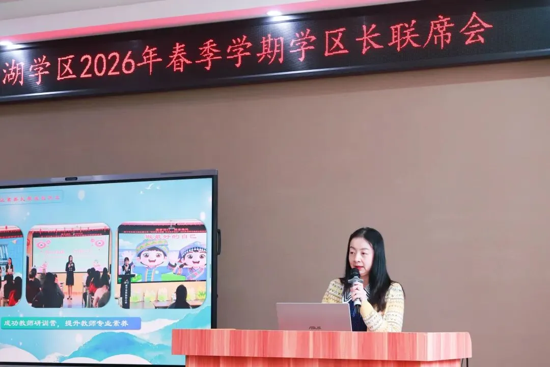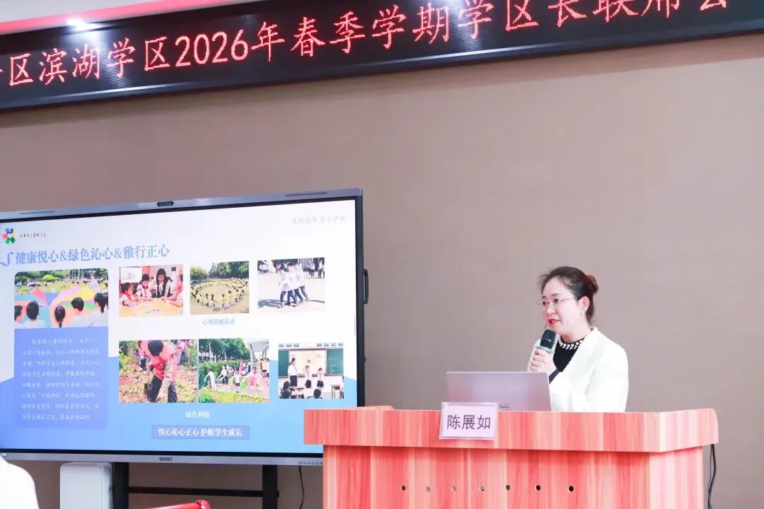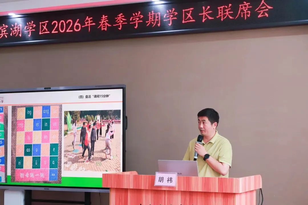 学区办公室主任王强汇报学区全年工作计划。2026年,滨湖学区将以“减负·提质·融合”为核心,聚焦“健康第一”、项目式学习、质量监测三大重点,细化月度任务,推动“三个提升、一个突破、三个落实”目标落地,保障各项工作高效推进。