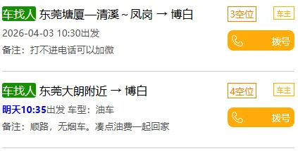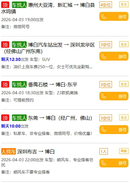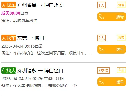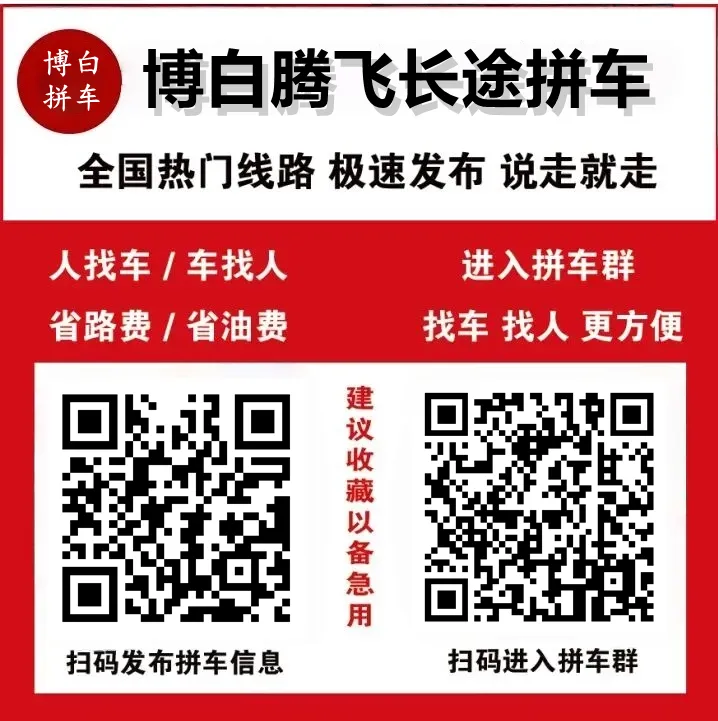 你不用去挤火车、客车,降低接触风险,而且只要你和车主(乘客)商量好,就能实现“家门口上车”,从此告别拥挤和不卫生;日常出行,临时出行很着急,有了博白腾飞拼车网,你再也不用买票、取票、乘车来回麻烦,看到拼车信息,即可高枕无忧出行啦;不管是开车,还是乘车,全部是咱们同城人,你可以尽情结交朋友。
