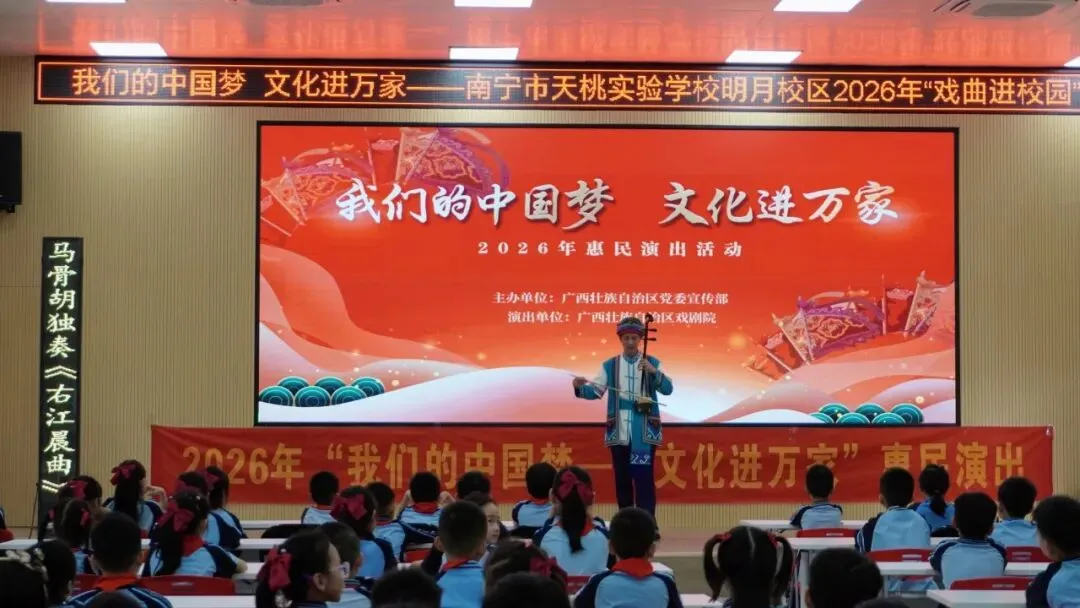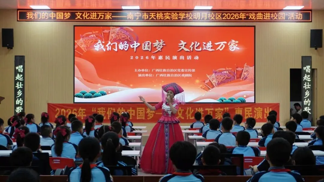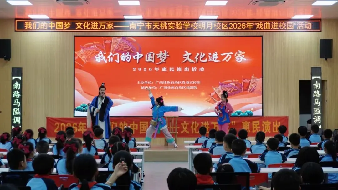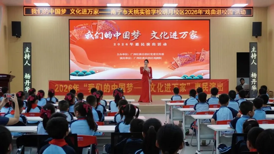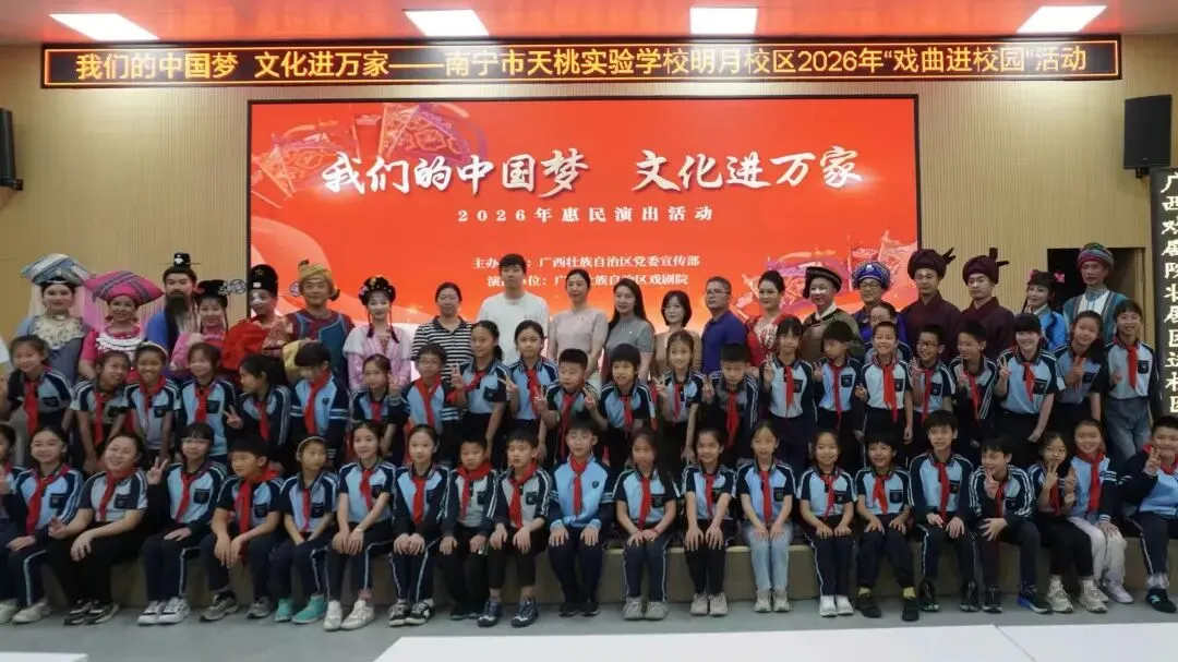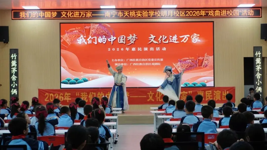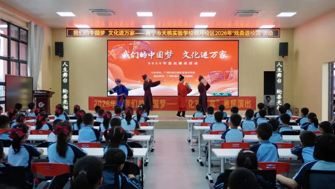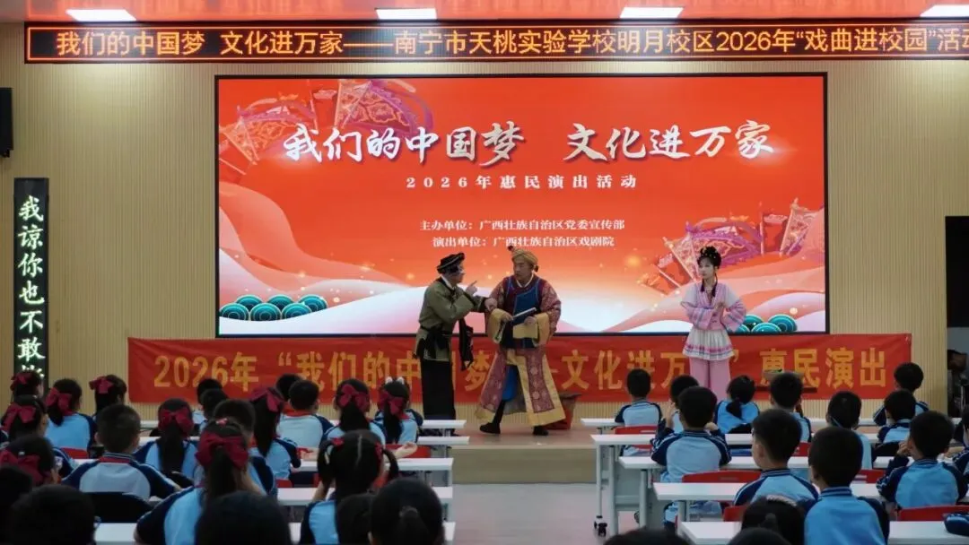 为传承中华优秀传统文化,丰富校园文化生活,提升学生审美素养,南宁市天桃实验学校明月校区于2026年3月27日下午开展了以“我们的中国梦 文化进万家”为主题的“戏曲进校园”惠民演出活动,广西壮族自治区戏剧院的演员们以精湛技艺和饱满热情,为师生们献上一场兼具民族韵味与艺术感染力的壮剧盛宴。