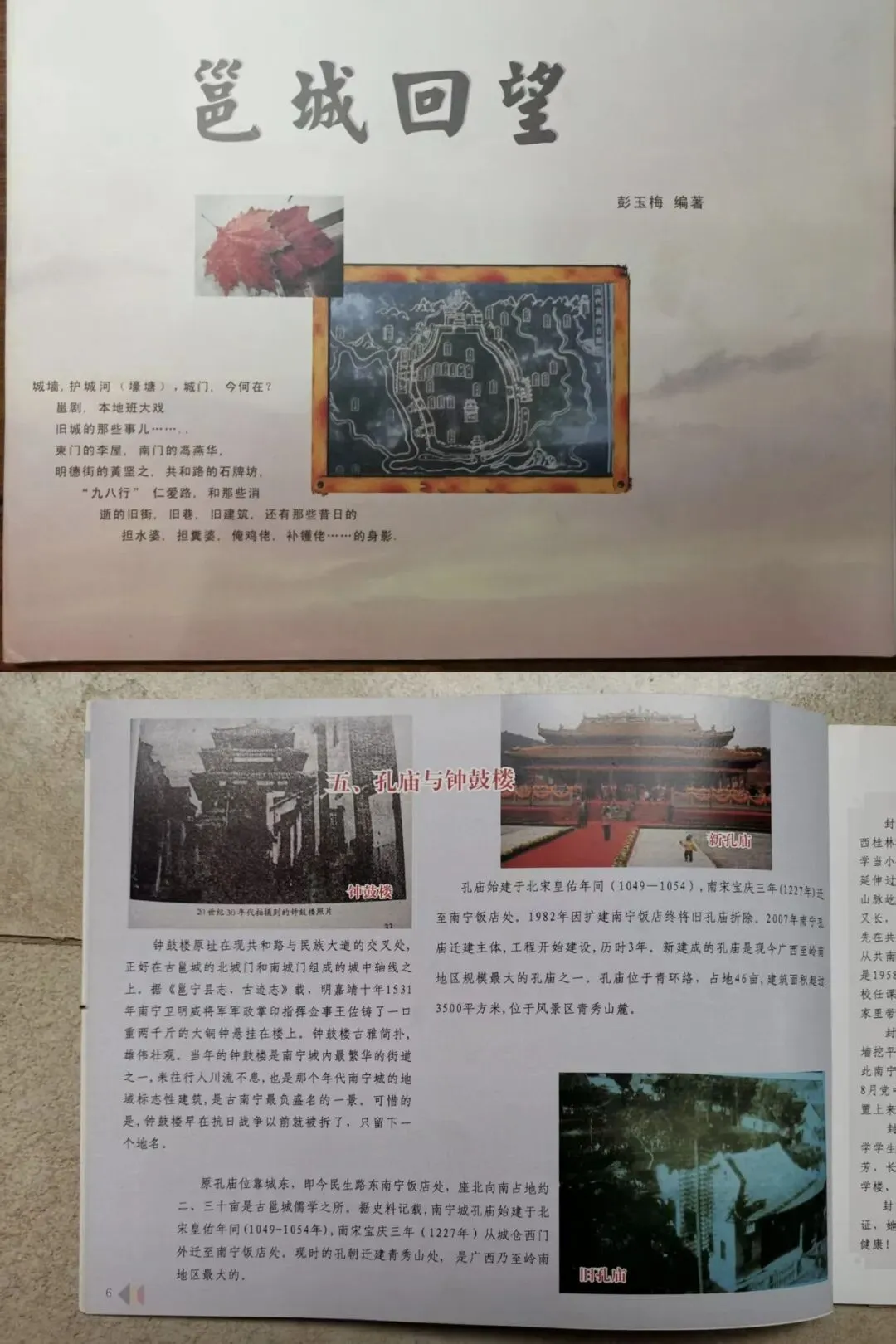 在得知我也喜欢钟鼓楼之后,彭玉梅特意挑出了三四篇她曾写过的钟鼓楼文章给我看。有《当年风光共和路》(2008.6.5南宁日报)《历史地标见证南宁发展》(2011.6.9南宁晚报),以及《邕城回望》一书中的“孔庙与钟鼓楼”等文章。这