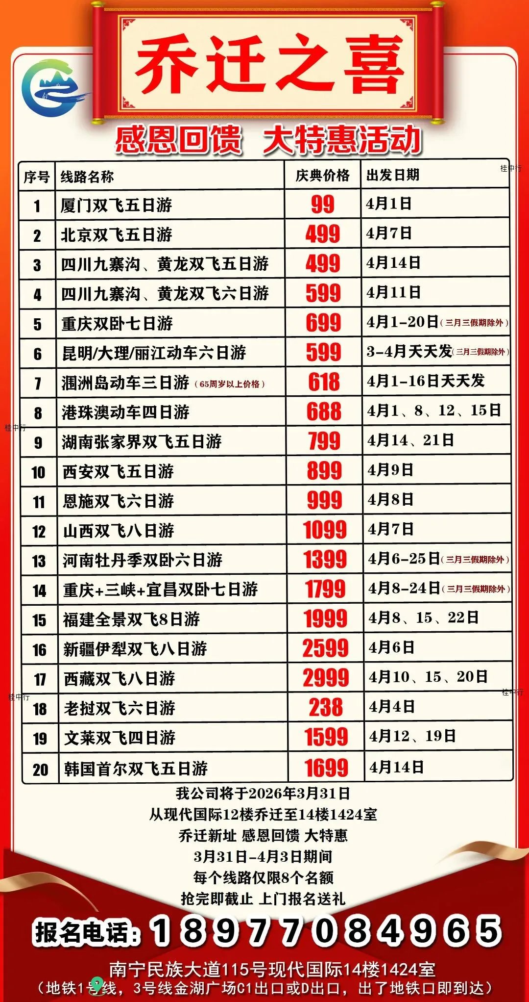 重磅消息!为了提升工作环境、提高客户服务水平、更好地展示公司实力、迎接新机遇、实现可持续发展,广西海外旅行社南宁第三分公司、广西康辉旅行社民族大道第一门市部、广西桂中国际旅行决定搬迁至:南宁民族大道115-1号现代国际14楼1424室。新征途!携手共创新辉煌!感恩一路有您!