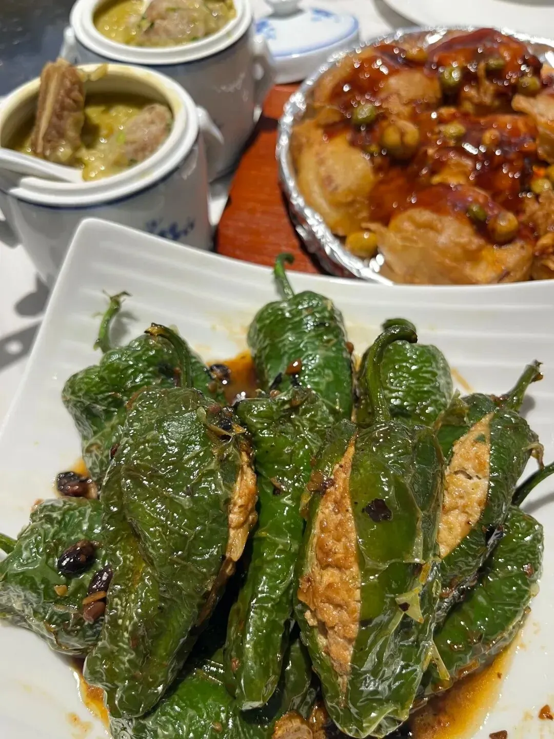 还有那盘油亮诱人的酿青椒,厚实的肉馅和青椒的微辣清香完美融合,下饭程度简直是一流。
