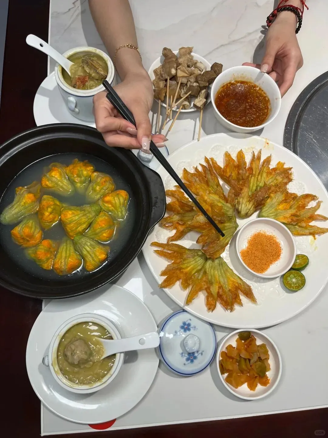 除了这个叫不上名的美味,桌上的各种特色酿菜也是一绝。新鲜的南瓜花里塞满了饱满的肉馅,水煮的做法吃起来清甜鲜美,带着原汁原味的香气;油炸的更是金黄酥脆,一口下去满嘴生香。