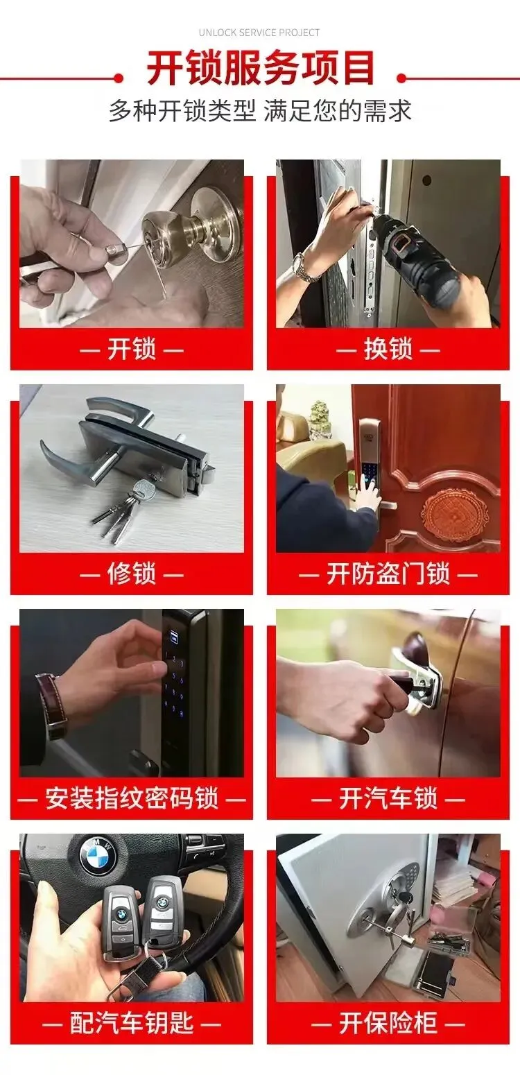 🛠️【服务内容|专业全面】✅ 家用门开锁(防盗门、木门、卧室门)✅ 换锁芯(A级/B级/C级锁芯升级)✅ 汽车开锁(不伤车、不破坏)✅ 指纹锁安装与维修🔒✅ 办公室门锁维修更换✅ 保险柜开锁维修✅ 钥匙复制、门禁卡配制👉 全程规范操作,保护客户财产安全