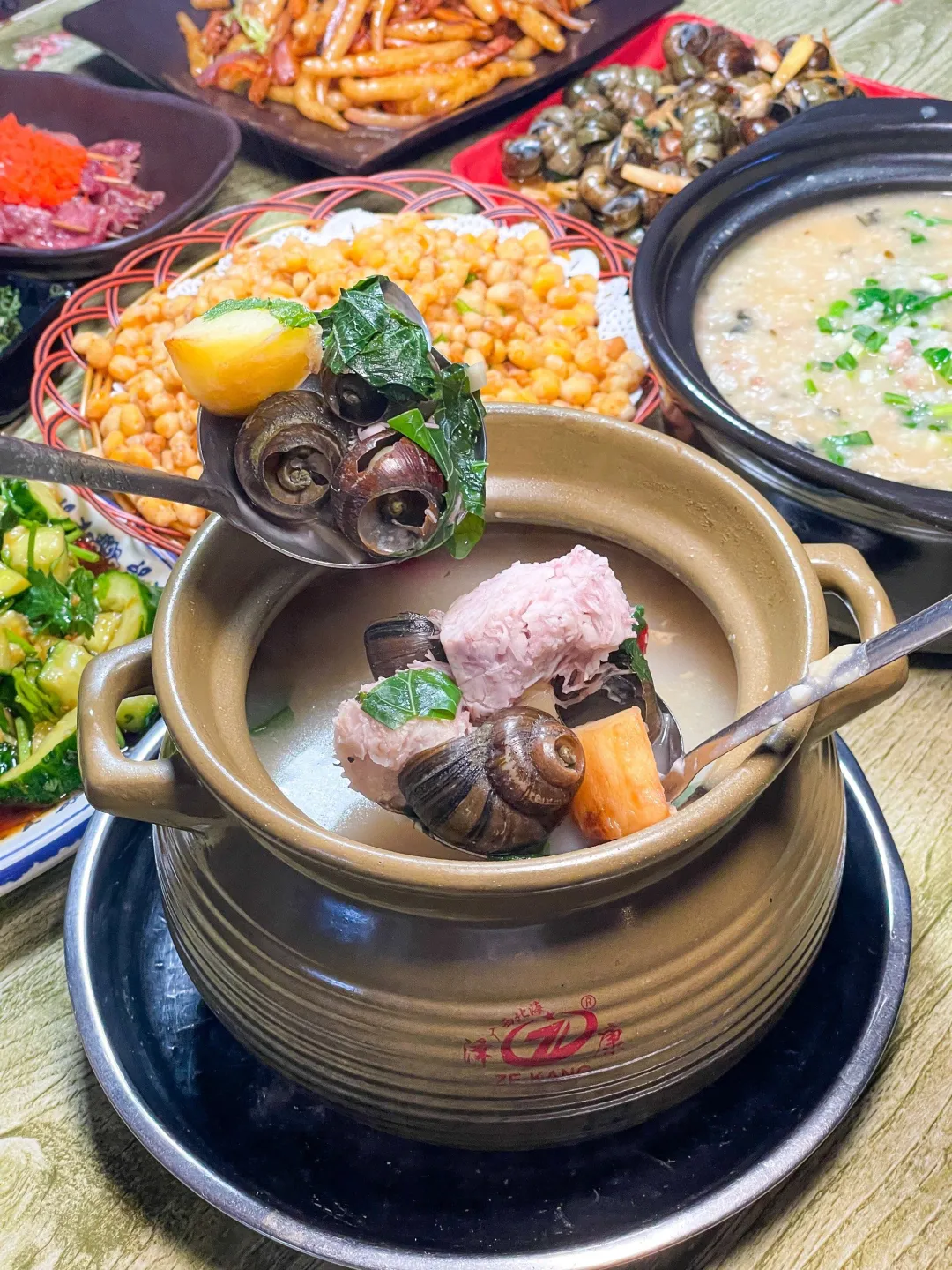 - 南铁夜市:拉叔沙煲螺是传奇,田螺煲加入酸笋、紫苏,汤汁浓郁,最后一定要加一份粉进去吸饱汤汁