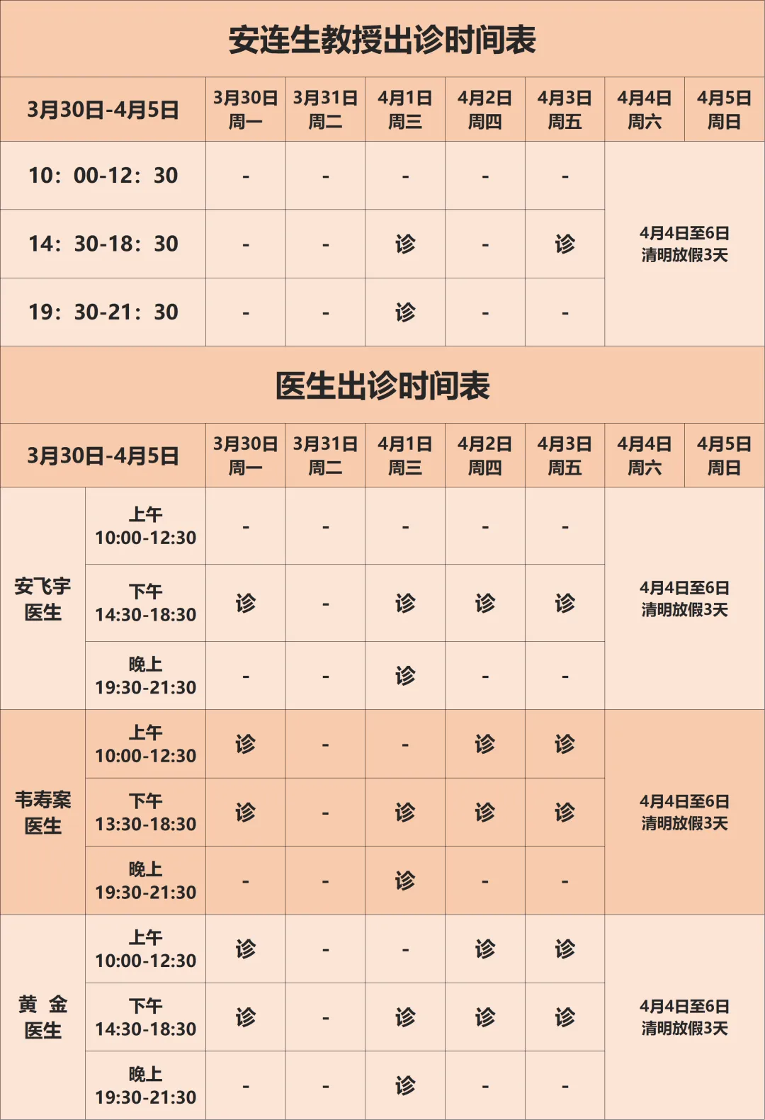 4月7日(周二)上午10:00正常开诊。