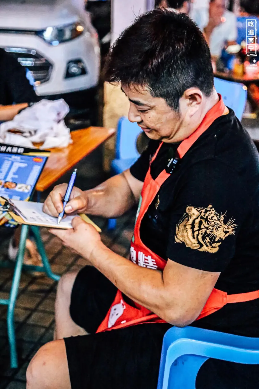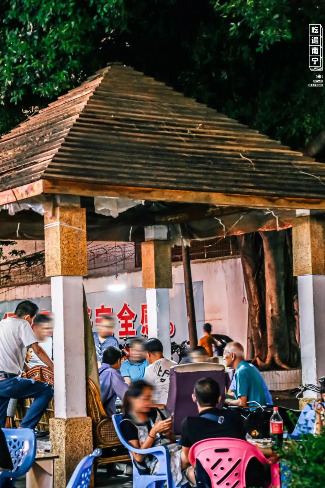 这家烧烤位于青秀区东葛路附近,准确一些说是位于鲤湾路如家酒店的斜对面,开在拐角处,着实有些偏僻。「波仔大排档」招牌大大的5个字,抢眼又高调。不少人光是听到「波仔」二字,就大有感触。“其实不太好意思说,我高中就经常来这里吃了”(还怕暴露年龄?)七点半敞开店门、八点生火烧炭、八点半摆出桌椅,10几年的时间,日日如此。三间档口门面,室外更像是「波仔大排档」的小花园,花丛边、凉亭间早早就有客人“霸”好了位置。老板波仔03年来到了南宁,一开始做生意失败得多,而且还欠了很多债。但生活的重担似乎并没有将他压垮,反而是把烧烤生意做得蒸蒸日上。这边给客人点菜的空隙,便托着塑料凳在一旁闲聊起来,那边给客人端酒的时候,勾肩搭背和熟客们手上各一杯酒,聊着聊着就能喝起来。