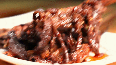 烤牛板筋,十分考验师傅的功夫。煮至断生的牛板筋斜切为薄片,串成烧烤串儿,放上烤炉,刷上蘸料,翻面来回烤上几次,便可上桌了。浓郁的烧烤味和香辣味扑鼻而来,一口下去,筋道弹牙的同时,又不失香软,更让人沉醉不已。“不夸张,这是我吃过最嫩的牛板筋!完全改变了它在嘴里怎么也嚼不烂的印象。”