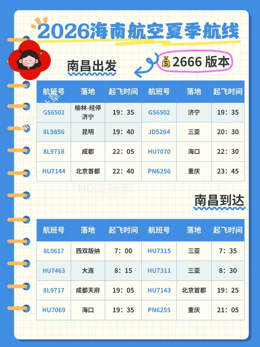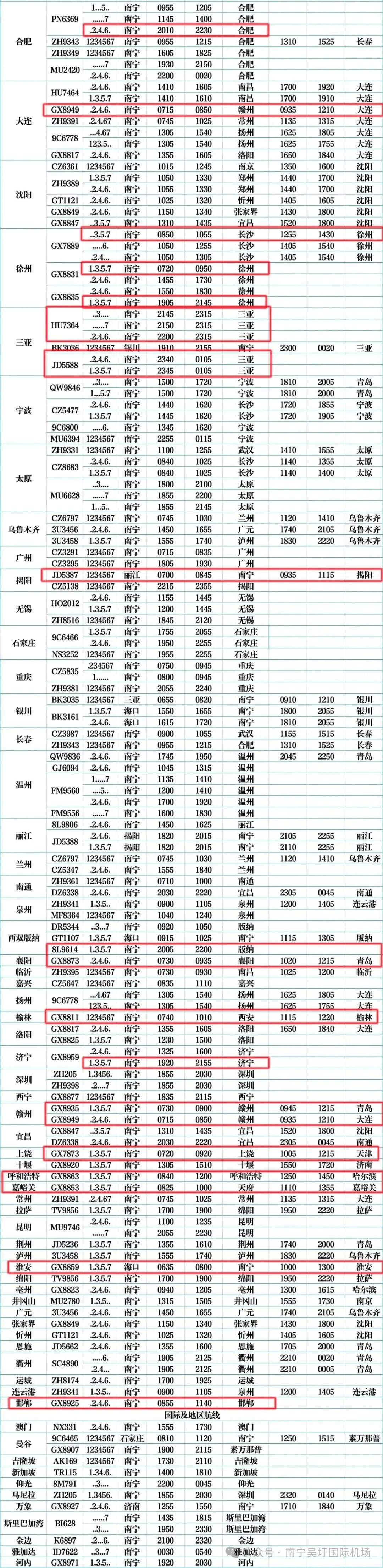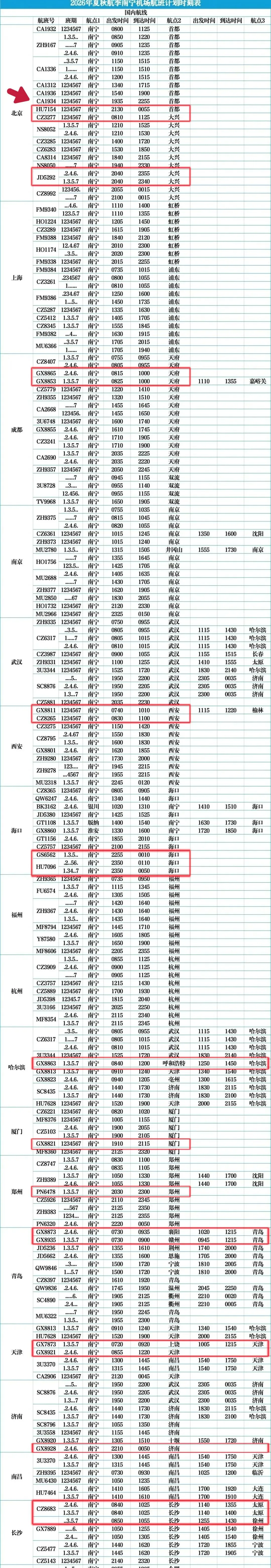 我发现写啥你们都挑刺,推荐海航PLUS卡也说我是水军,我连自己周围的朋友都没转发过链接,全凭大家自愿。现在燃油税说是要调,又开始唱衰了,咱不能因咽废食啊,要出门的再涨价也会出门,不爱出门的,你就是不要钱人家也不一定想出门。你们说对吧?今天春夏航季已经开始了,最后更新两个机场,其他的可以看文章末尾的链接清单,没有的城市就不会继续更新了,好吧。南宁机场的是用的南宁机场官方的机场航班时刻表,我把符合PLUS 卡条件的选出来了,大家可以参考。1️⃣不是所有的航班每天都有,可能一三五,可能二四六,有的甚至只有周六或者周二才有。支线城市中如果往返乘客都少,取消是很正常的现象。