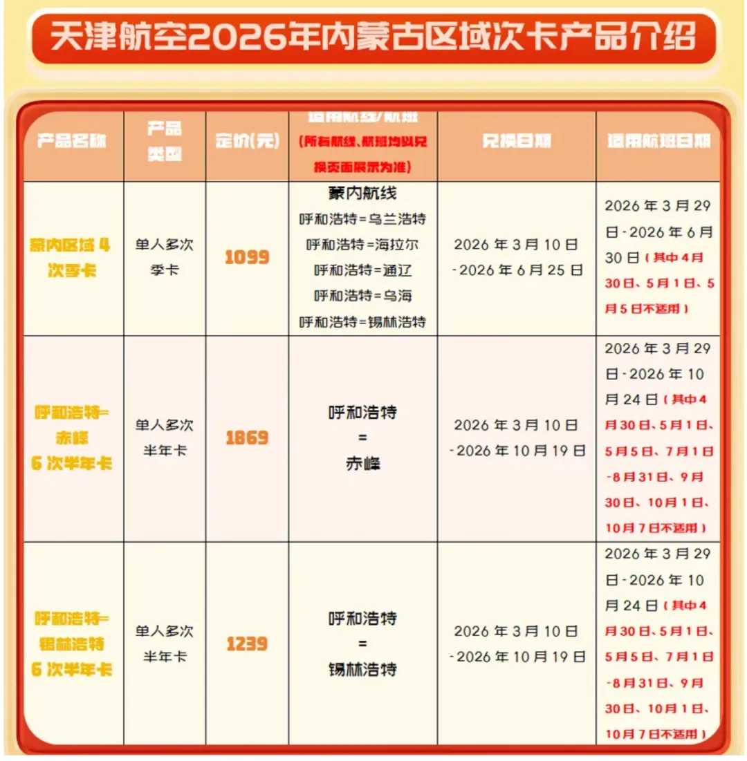 最近看官方信息的时候,看到不少机场联合航空公司发布了区域次卡,譬如天津航空在内蒙地区就有下面这个产品。如果大家有兴趣,可以多去翻翻你们感兴趣的出发机场/到达机场,如果没时间查,或者不会查,你们留个言,如果我看到有合适的就给你们发出来啦。你看,之前航线清单,想看的许愿的,基本上都满足了。有些朋友是头回刷到这里,还不太了解这个海航这个PLUS卡到底怎么用,可以看以前的内容复习一下。之前做过的地区航线清单,可以看下面链接,点击会自动跳转。