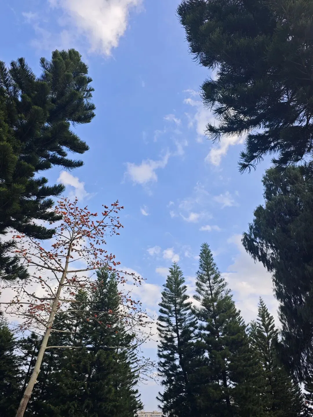 园里有不少这种尖尖的圣诞树形状的树,我觉得特别漂亮,拍照片也特别好看。