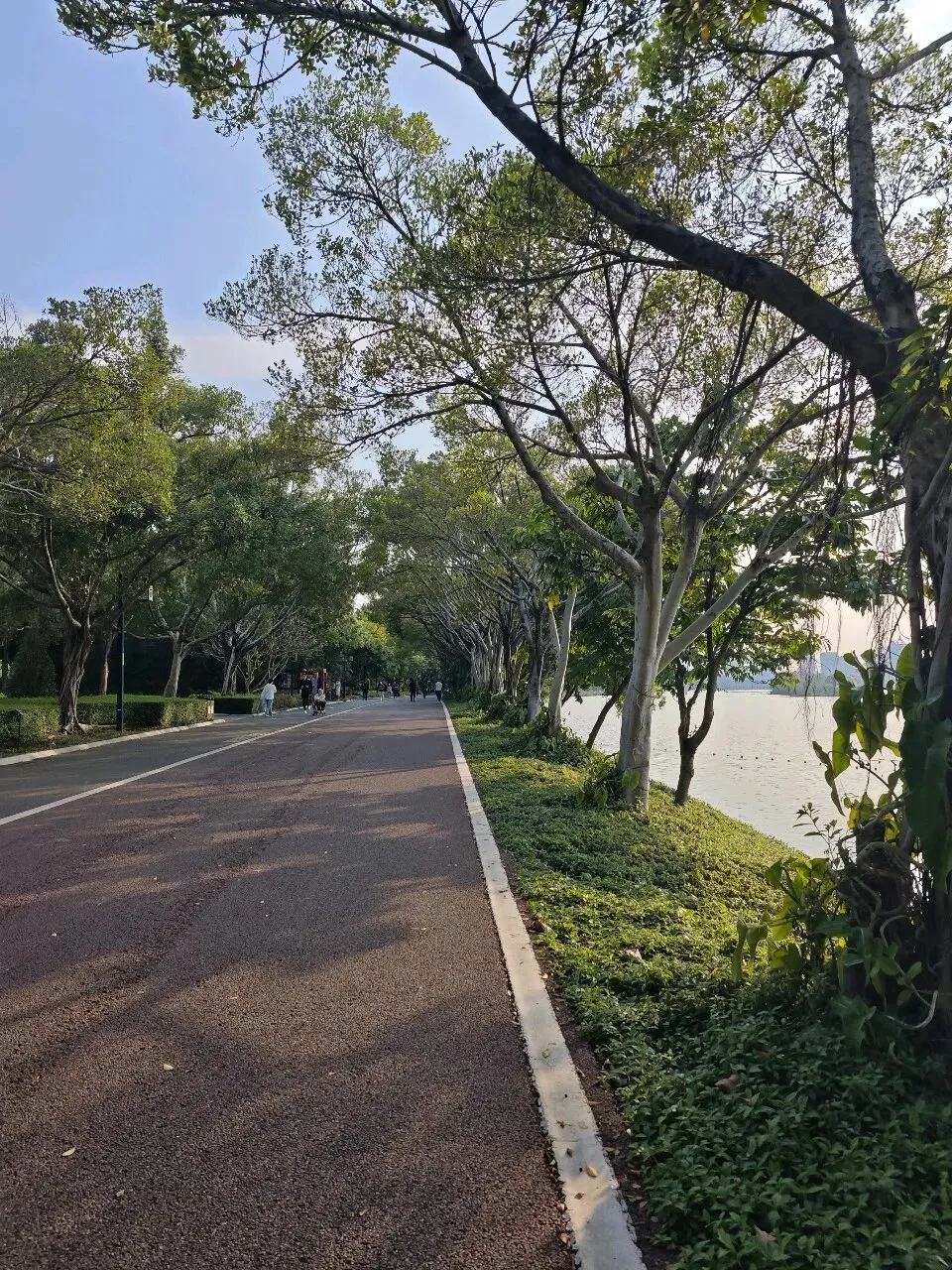 湖边修建了非常宽敞的双向跑步塑胶路,非常适合散步、跑步。路两边种满了树,风吹过来非常舒服。