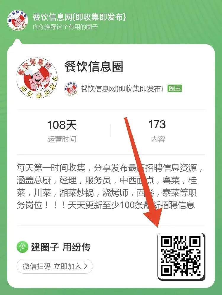 因公众号每天只能更新一次,导致有很多招聘信息资源没能第一时间更新发布,所以特意创建了一个纷传餐饮招聘信息圈子,方便找工作的餐饮厨师同行,主要是发布广西区域,广东区域,日料寿司刺身和省内精选信息,公众号没有的,圈子里面都有,如果大家对于招聘信息资源需求比较多,可以选择点击下方小程序加入餐饮信息圈!每日至少提供100条以上最新招聘!!!目前定价是10元一个月,2个月18元,按天算一天才3毛钱,每天花2个多小时时间。本质也是等价交换,如果觉得值,并且需要更多资源,可以点击下方小程序加入一下吧!