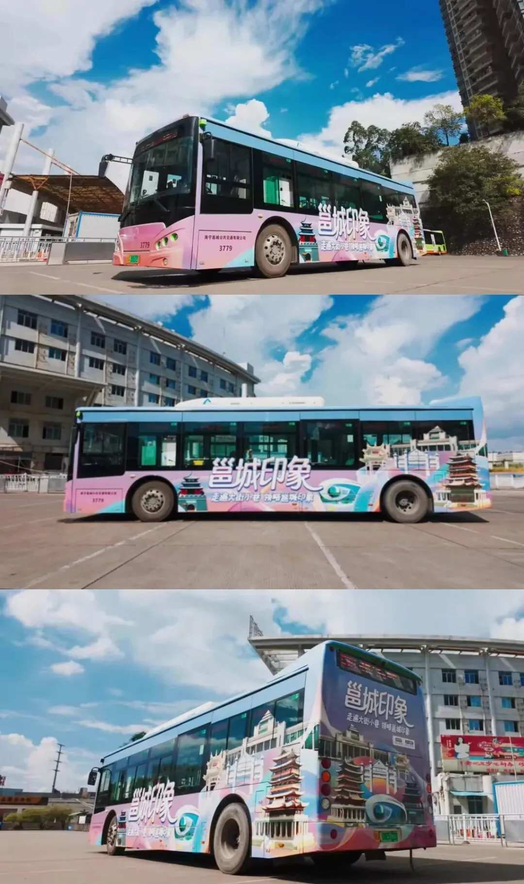 粉紫色车身印满三街两巷、青秀山、钟鼓楼等邕城地标卡通插画,行驶在路上,就是春日里最亮眼的 “显眼包”,随手一拍都是氛围感大片,定格三月三邕城美好。