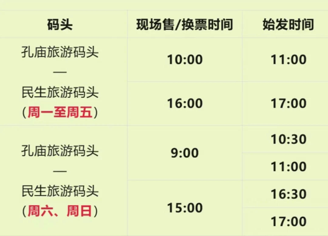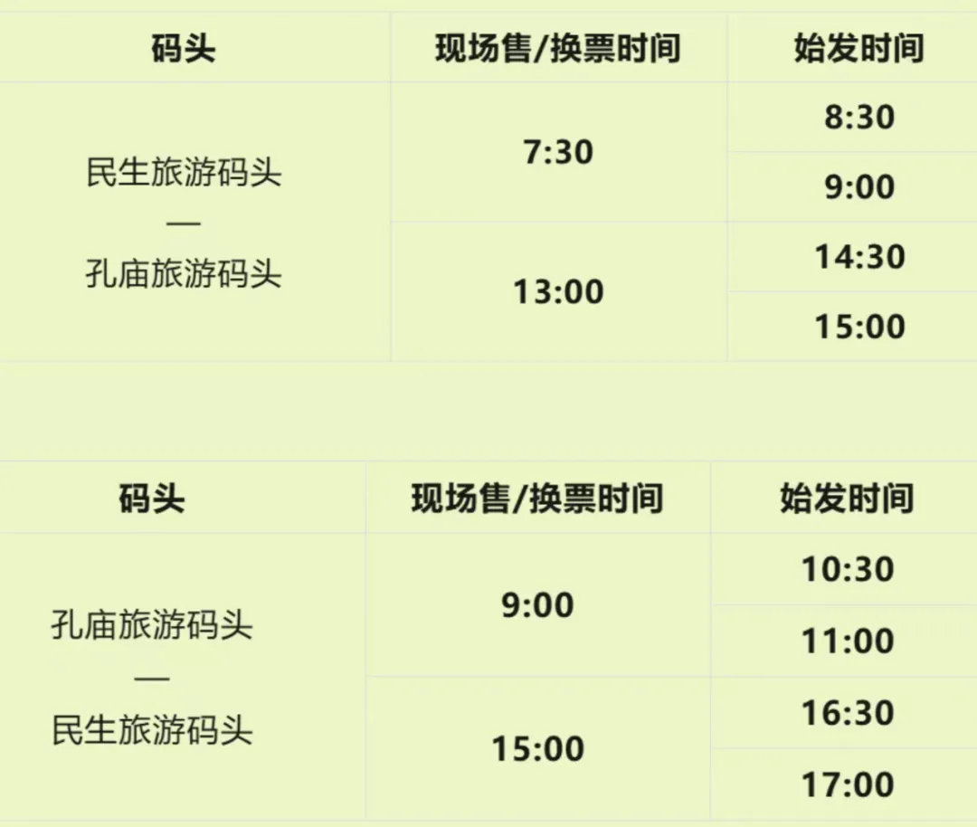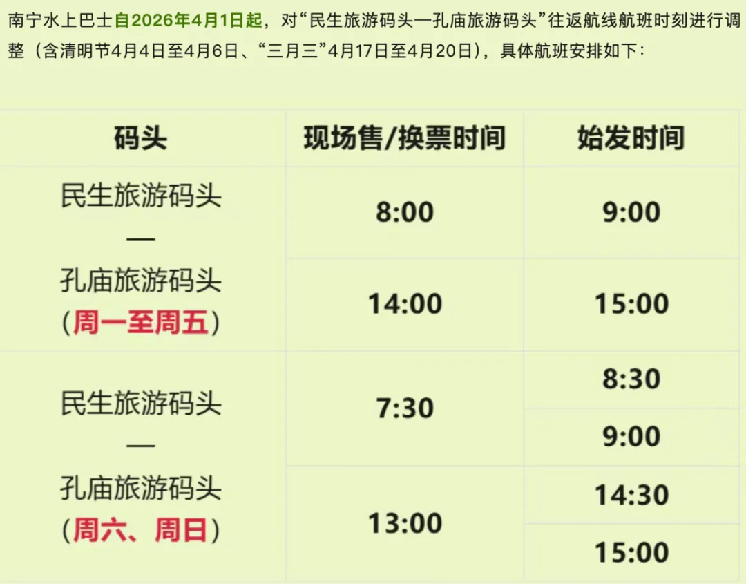 南宁水上巴士自2026年4月1日起,“民生旅游码头—孔庙旅游码头”往返航线航班时刻(含清明节4月4日至4月6日、“三月三”4月17日至4月20日),具体航班安排如下: