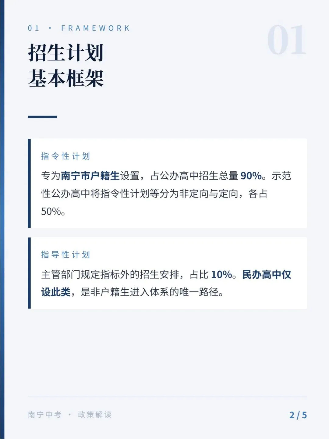 指令性计划是南宁市为本地户籍考生专设的升学渠道,在公办高中招生总计划中占据90%的比重。在示范性公办高中层面,指令性计划进一步划分为指令性非定向(占指令性计划的50%)和指令性定向(占指令性计划的50%)。指导性计划则是教育局规定指标以外的招生部分,在公办高中招生中占比10%,而民办高中则全部采用指导性计划招生。