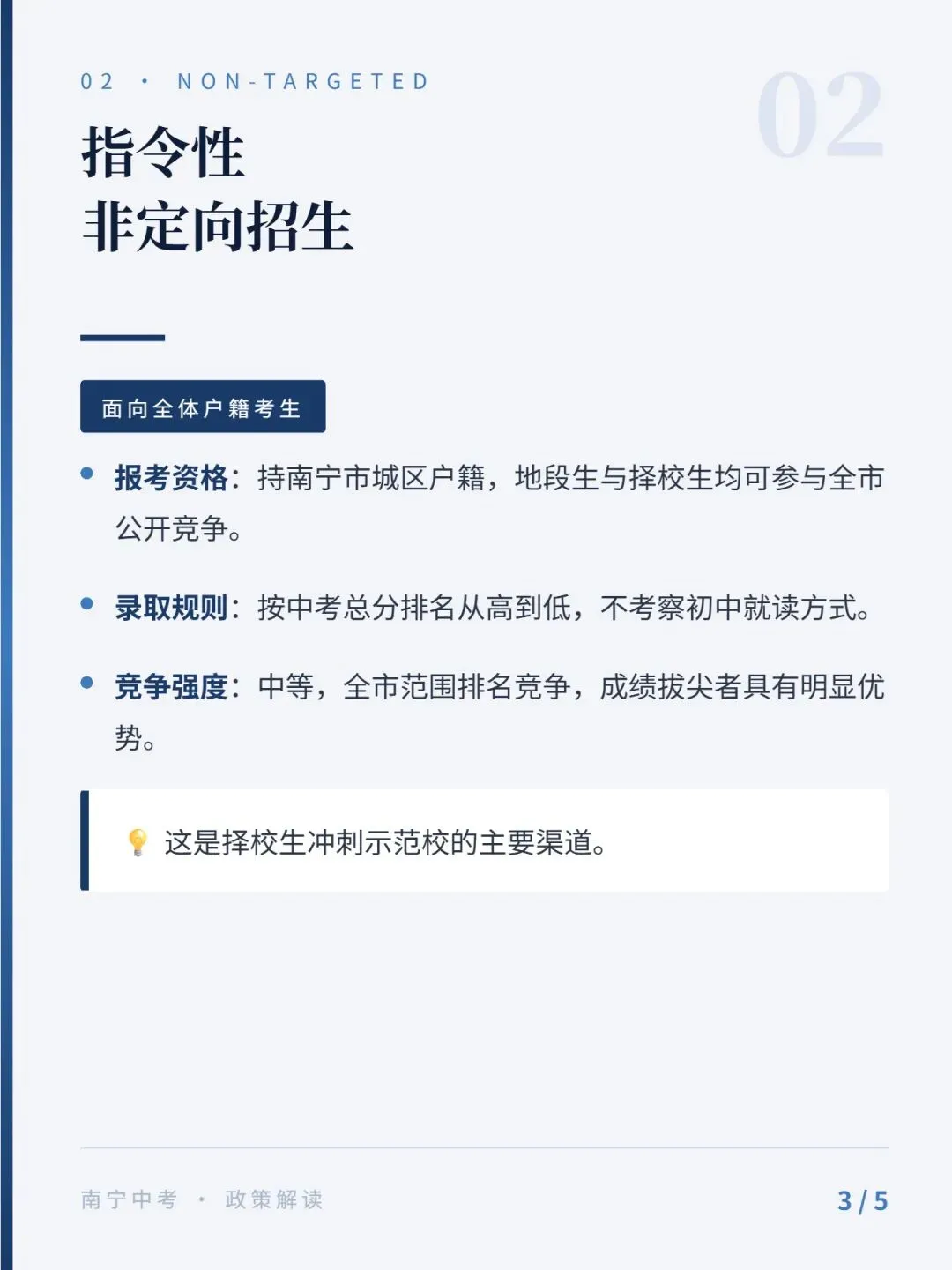 指导性计划在中考录取顺序中位于最后阶段,是非南宁市区户籍但拥有南宁市区学籍考生的唯一升学选择。由于名额相对较少而竞争人数最多,这是三种计划中竞争最为白热化的赛道,录取成绩通常比指令性计划高出1-2个等级。