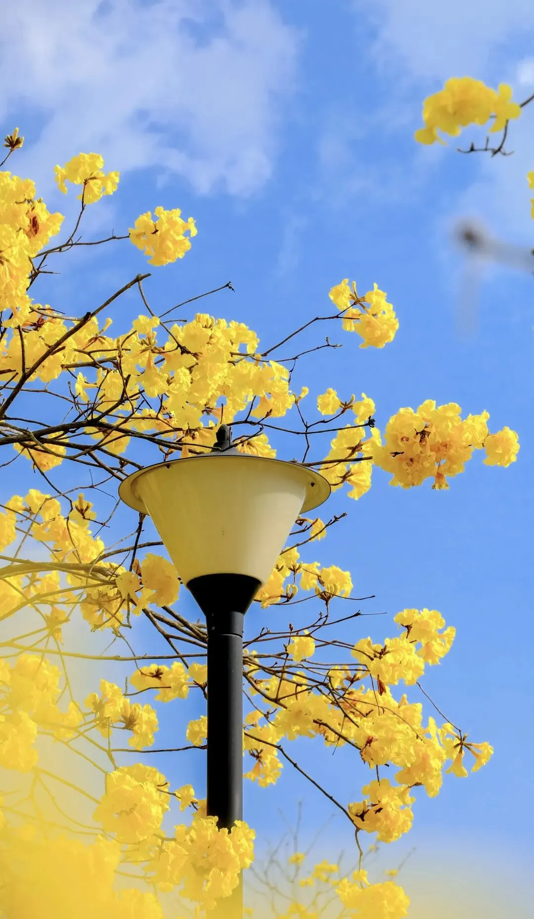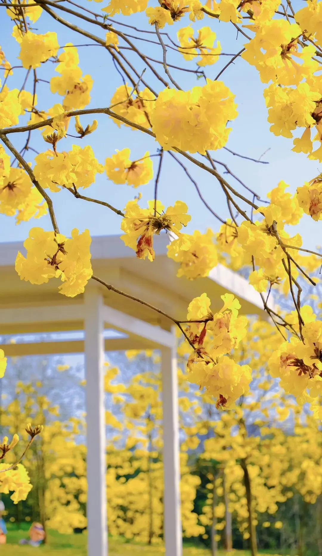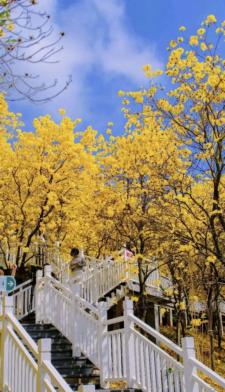 漫山遍野鎏金,只见花不见叶,风一吹,满树小铃铛在晃,白色栈道+黄金花海+蓝天,随手一拍都是治愈系壁纸,不用滤镜,原图直出美到失语!