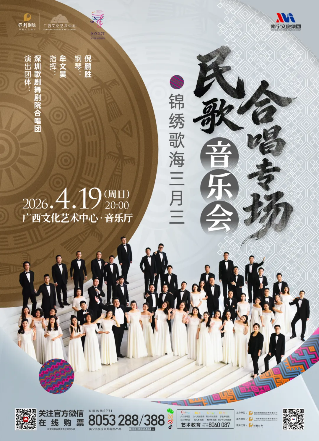 2026年4月19日,深圳歌剧舞剧院合唱团唱响广西文化艺术中心,以“唱游神州”为主题,锦绣歌海“三月三”——民歌合唱专场音乐会,向广西观众展示多彩的民族音乐版图。