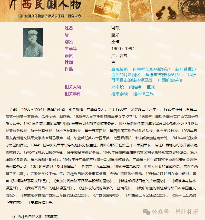 广西壮族自治区图书馆网站也有冯璜简介和照片(下图),其照片与《广西一览》中的一模一样。