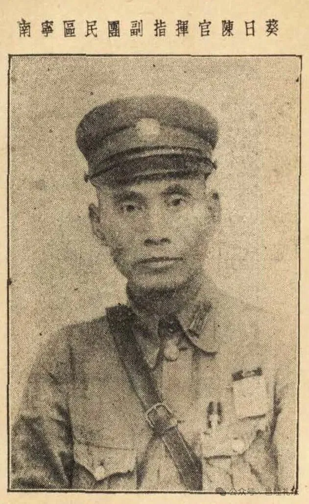 虽然在《广西一览》有陈日葵担任南宁区民团副指挥官时的照片,但笔者前几年走访看望抗战老兵梁增孙时曾拿这张“南宁警备司令部”老照片给梁老看过,梁老当即认出右一是陈日葵,因为梁老曾是梁翰嵩将军的警卫员兼司机,故接触这类高级军官的机会应该也挺多,后来梁老提及陈日葵是宾阳黎塘人,活到60多岁时病故了,其余有关陈日葵的信息则不详。