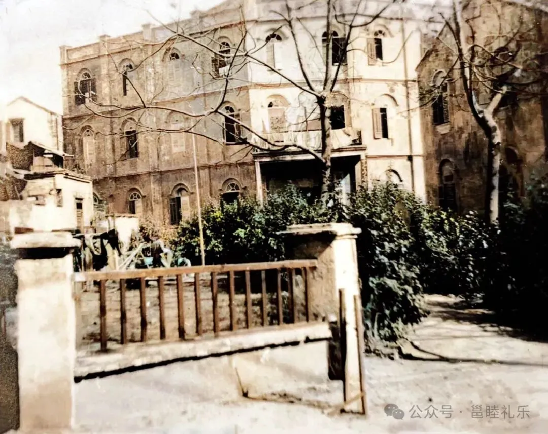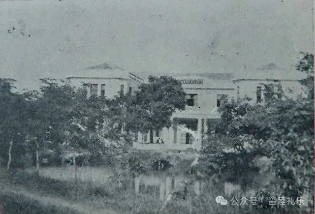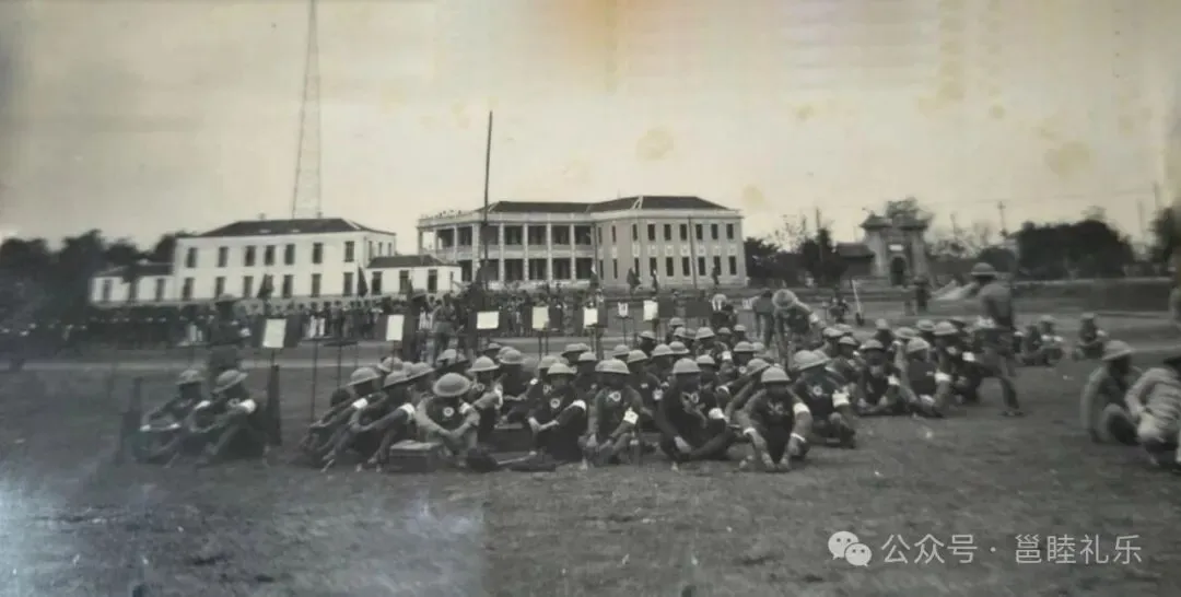 1935年南宁的中学生在中山公园北门外的草坪上进行军事演习训练,远处的背景的两座建筑即是广西省立第二图书馆的馆舍与教职工楼,以及中山公园的北大门。