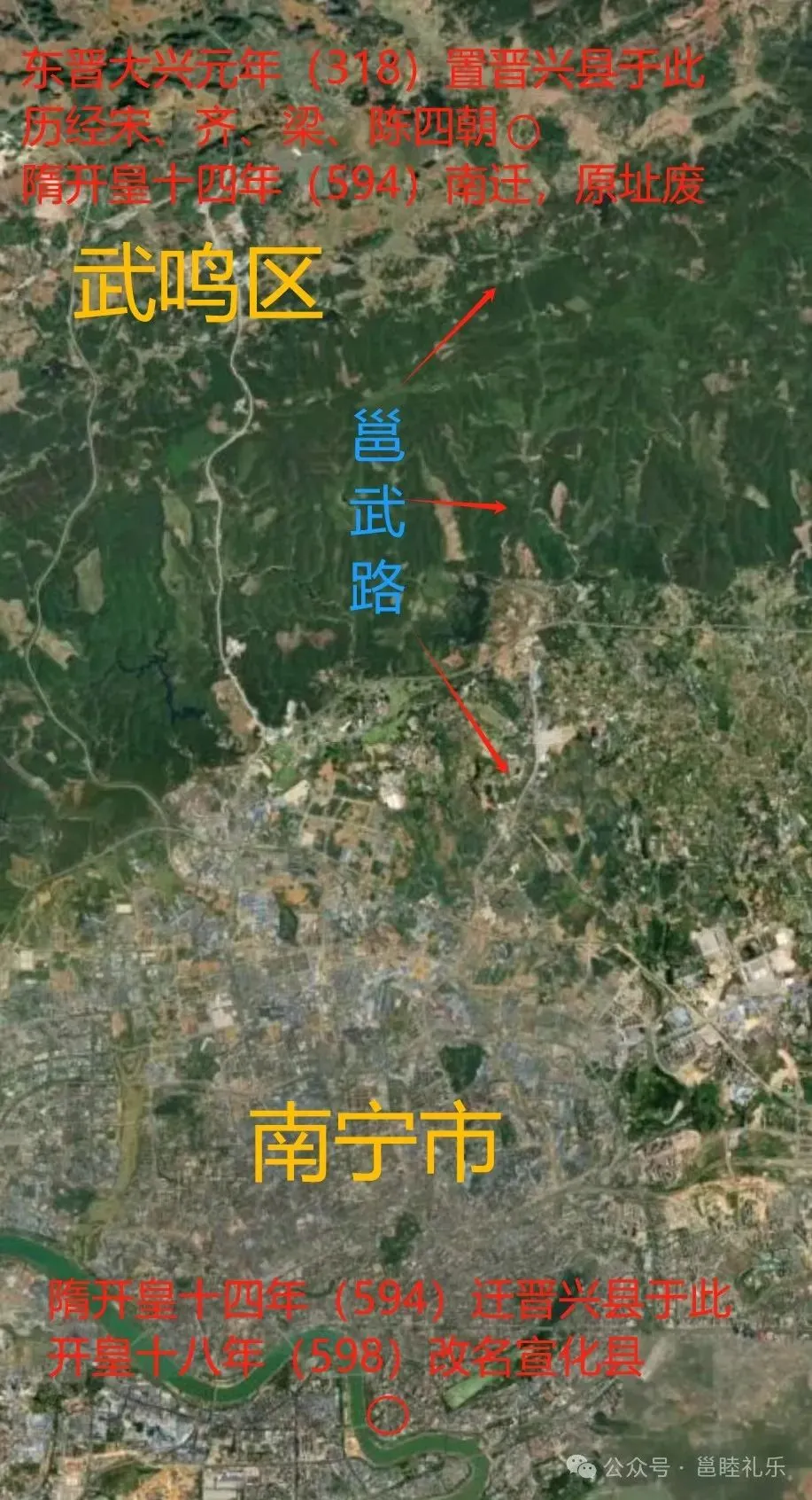 既然如此,为什么古今将晋晋兴郡、县建置之时作为宣化县有建置之始的,又不乏其人呢?作者认为:这和古籍行文过于简略、或传抄中漏字、漏句等造成的含义模糊、混乱有关。如《隋书·地理志》记郁林郡“宣化,旧置晋兴郡,平陈,废为县,开皇十八年改名焉。”就很容易造成晋初有郡无县,及宣化县是晋兴郡治所在地,是晋晋兴县改名的误解。又如前引《元和郡县图志》关于邕州总述中的“隋开皇十四年废晋兴郡为晋兴县”的一句,也极易造成初有郡无县,后废郡存县,而此县后即改名为宣化县的误解。对这些问题,有的史书已早有记载,有的学者已作过考证与解答,如设置晋兴郡时是否即同时置县?《宋书》、《南齐书》即记其时晋兴郡领有晋兴、熙注等八县,且未言为该朝新置,《旧唐书》更明言:“晋兴,晋于此置晋兴郡。”洪亮吉考证东晋时晋兴郡即领有晋兴等八县,洪齮孙、臧励和考证梁、陈二朝晋兴郡亦仍领八县未改,顾祖禹亦认为“晋兴县,太兴初置,为晋兴郡治。”清末历史地理学家杨守敬亦认为“宋志晋兴郡治晋兴县,则县当亦晋置。”(《隋书地理志考证附补遗》卷第八,见《补编》第四册)又如关于《隋书》“废为县”一语,杨守敬在上文中,于引用元和志之后,作出了“隋亦有废置迁徙也”的解释。作者理解:杨氏的“废”,指废除晋兴郡及晋兴县;“置”,指于废县所辖之地即今南宁市区别置了一个晋兴县;“迁徙”,指废了县治设于苏(宫)村的原晋兴县,置了设治于废县辖地今南宁市区的新晋兴县,县名未改,辖境仍旧(废县治仍属新县境,从《新唐书·地理志》记武德五年“析宣化县地置武缘、晋兴、朗宁、横山四县”中得以证明,因武德所置之晋兴县治即晋晋兴县治原地也),实际上只是县治在原县境内的“迁徙”而已。从这个意义上讲,说“废为县”,也是合乎事实的。杨氏此说,阐明了《隋书》此语的真谛,只不过从南宁市区有建置之始而言,则应从晋兴县治迁到这里,即“别置”时,才算始有建置,在现武鸣县境双桥乡苏(宫)村设治的晋晋兴县,自不能计人南宁市区建置的时间。这说明,对于这些易引发歧义的文句,要根据史料、史实,进行多方面的对比、分析、研究,不能只抓住其中一句或几句话就下结论。