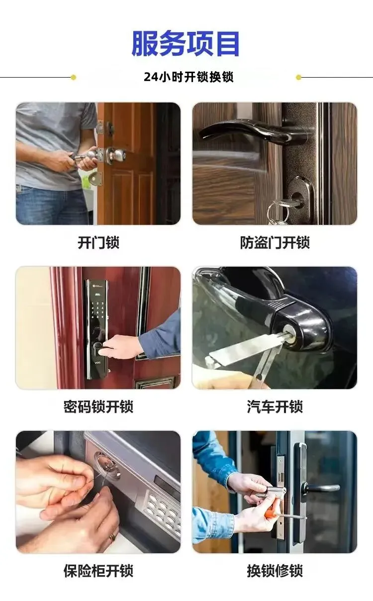 🔑 家庭开锁:防盗门开锁、室内门开启、更换锁芯🚗 汽车开锁:车门解锁、钥匙匹配、遥控维修🏢 商业开锁:店铺门锁、办公门禁、玻璃门维修🔐 换锁服务:更换锁具、升级防盗锁、安装智能锁🧰 锁具维修:锁芯卡顿、断钥匙处理、锁体修复🚪 安防升级:指纹锁、密码锁安装调试