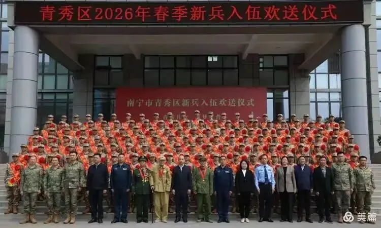 2026年3月中旬,绿城南宁春光明媚,万物生辉。我应南宁市青秀区征兵领导小组之邀,赴青秀区武装部参加春季新兵欢送仪式,并以边境自卫反击战老兵身份登台致辞。在军旅生涯四十一载里,我送别过成千上万的退伍战友,却第一次以“送兵人”身份到武装部,为即将奔赴军营的新兵送行。仪式在雄壮的《中华人民共和国国歌》声中启幕,这次欢送以“传承英雄血脉,投身强军伟业”为魂。