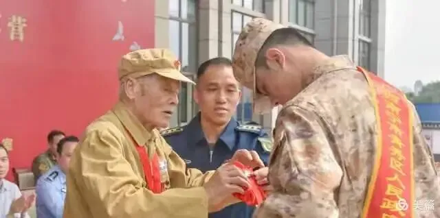 抗美援越、援老抗美英雄陈雄福,亦庄重为孙儿陈冠烨整装壮行。一枚红花,三代戎装;一道绶带,两代荣光。