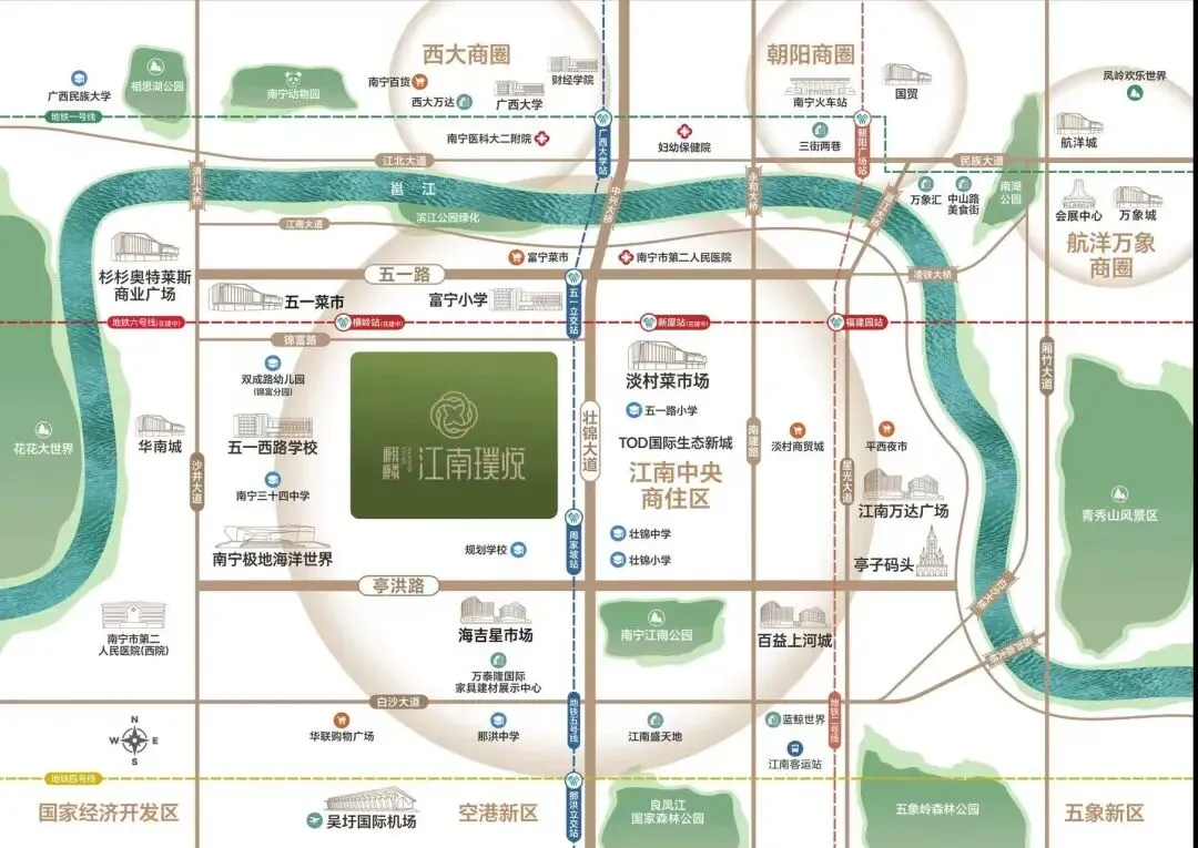 三桥四横四纵交通体系高效织就,约10分钟车程覆盖江南主城核心区域。北倚五一路——江南老城东西向主干道,串联清川大桥、永和桥、中兴大桥,快速接驳相思湖、西大商圈、朝阳广场及青秀核心区,畅享全城资源。