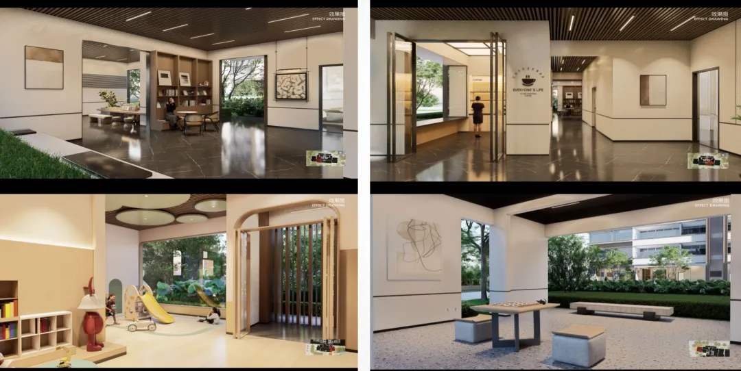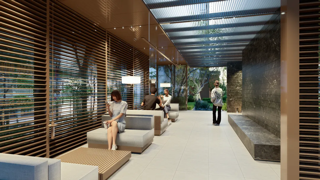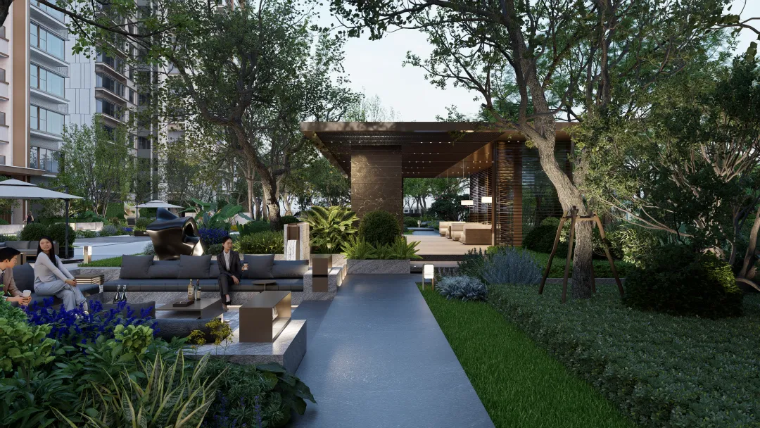 设置精致的酒店式花园会客厅,以自然为背景,打造一处静谧会客厅,附近还规划有会客水院和休闲花园等功能区,在特选朴树和周围在花境的烘托下,打造独有的专属私人休闲功能区。会客厅采用格栅围合而成的连廊,布置茶几、沙发,这里休息、会客、洽谈回归慢生活,享受友好和谐的社区氛围,增加邻里沟通交流。