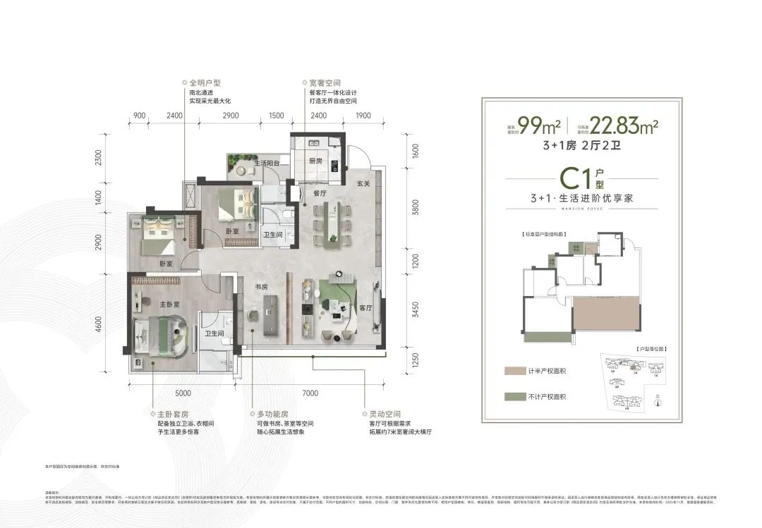 ▋明星户型:建筑面积约99㎡ 3+1房两厅两卫 可拓展面积22.83平米 得房率约106%