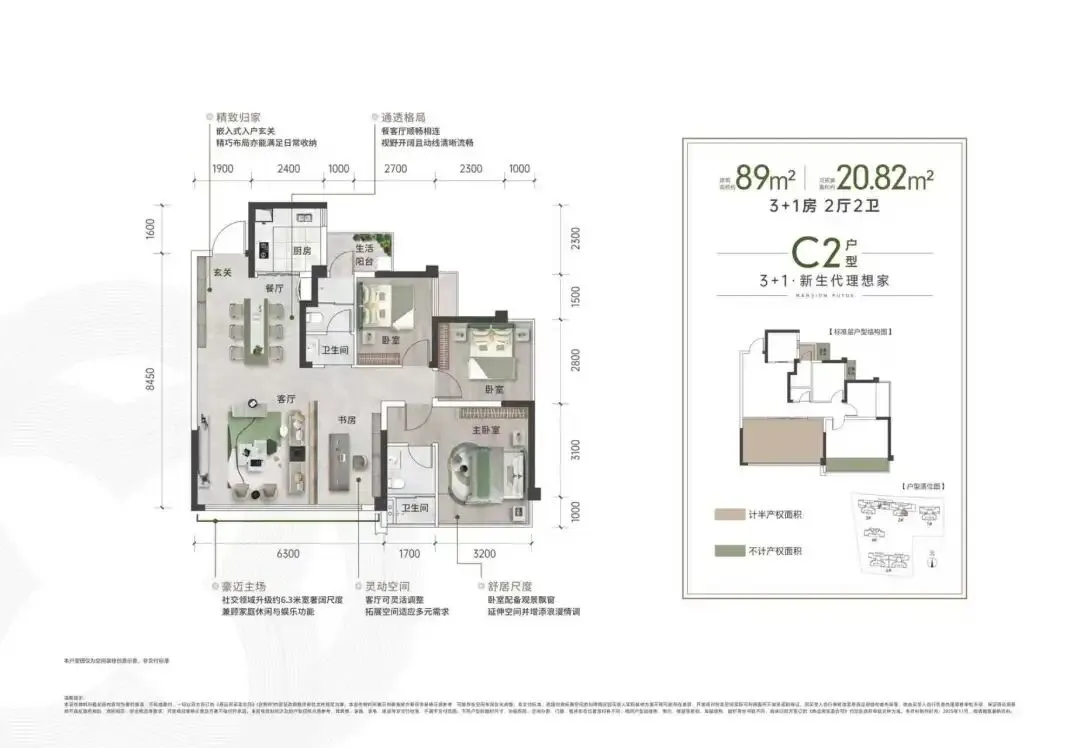 ▋爆款户型:建筑面积约89㎡ 3+1房两厅两卫 可拓展面积20.82平米 得房率约106%