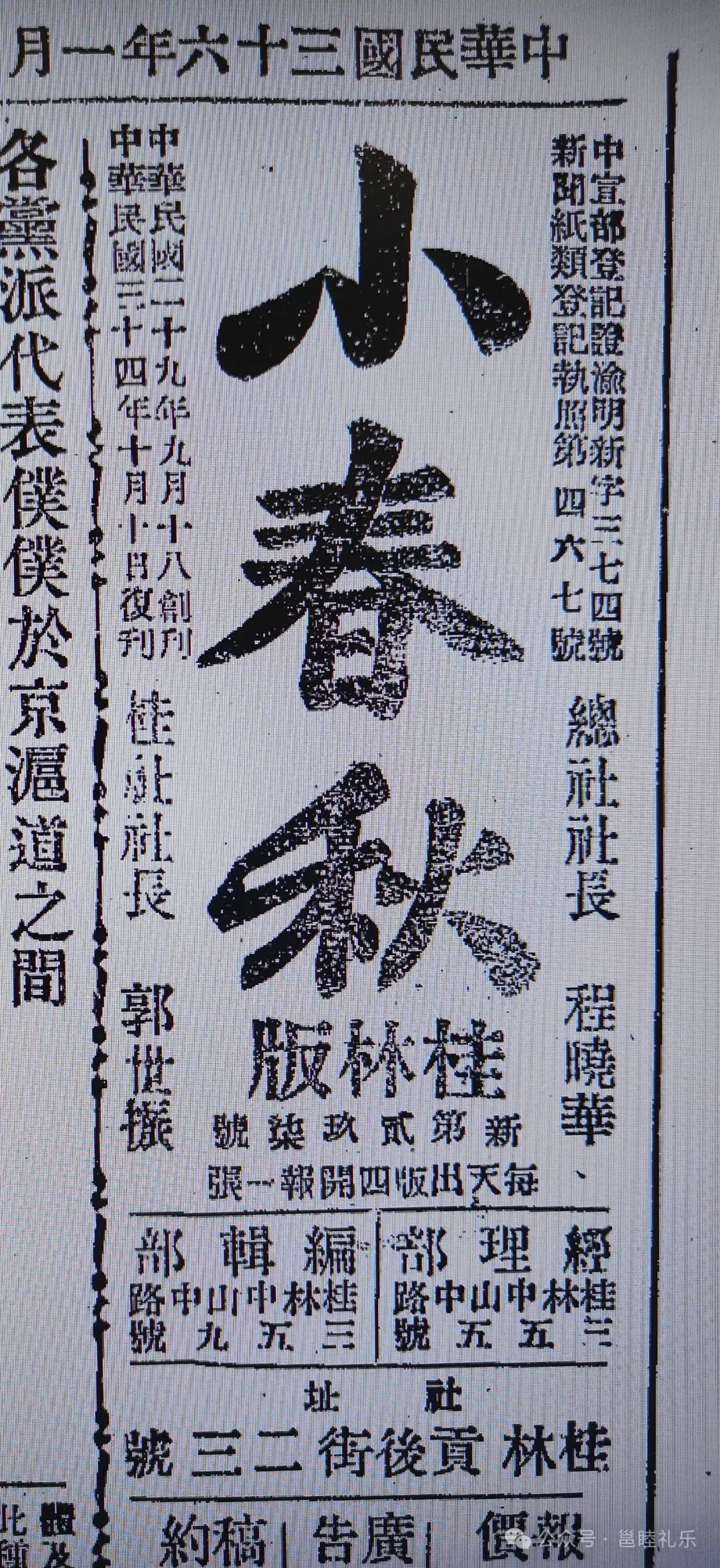 小春秋报 民办,发行人郭世振,社长李建平,总编辑石知寒。该报原在桂林,于1949年冬迁来南宁,10月1月出版,11月月底即停,报纸为4开4版,铅印,三日刊。