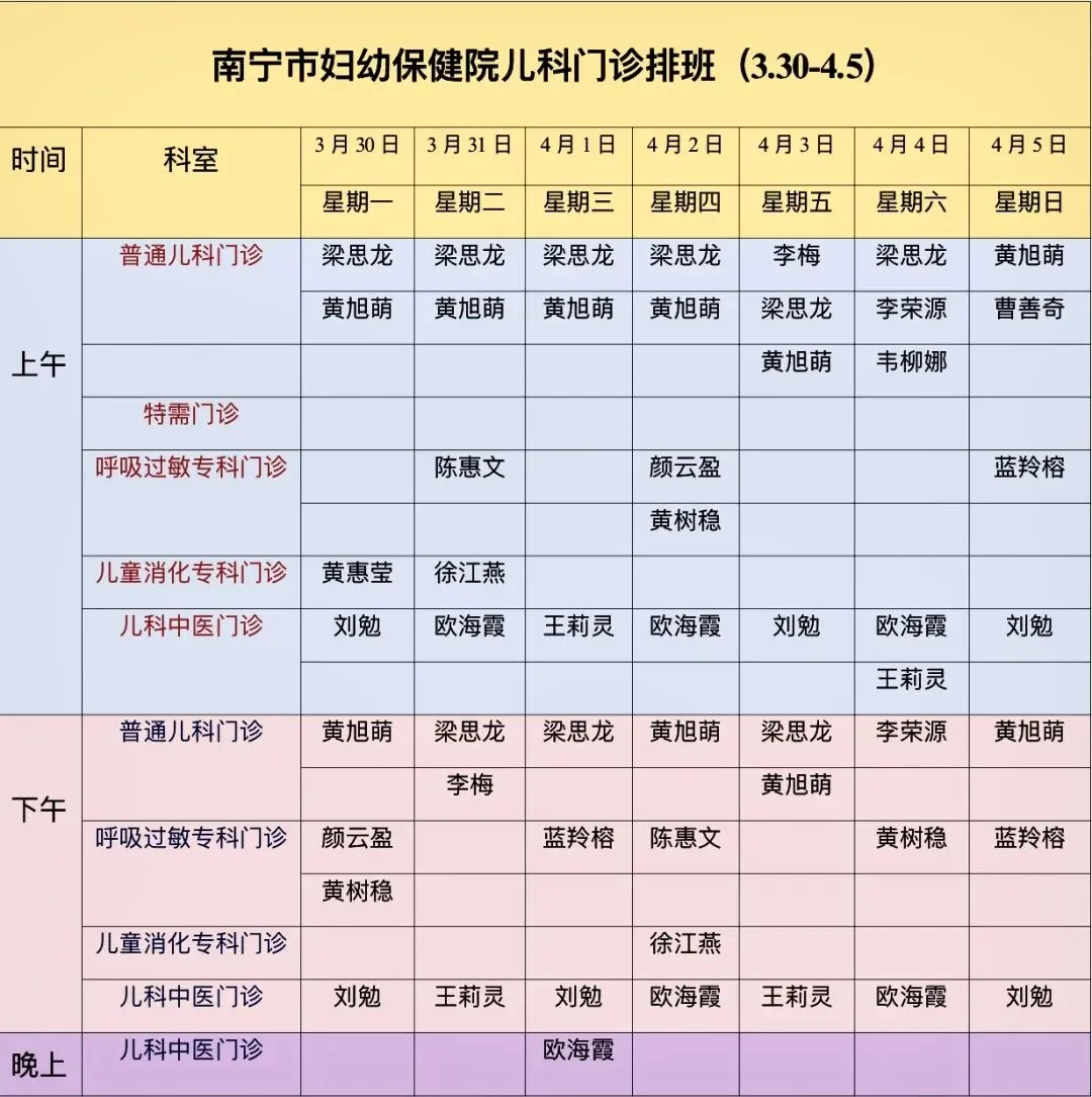 南宁市妇幼保健院儿科门诊医生排班表(3月30日~4月5日)