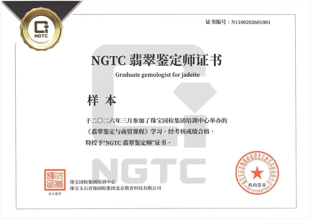 参加课程的学员, 经考核成绩合格(大于或等于60分),可获得珠宝国检集团培训中心颁发的 “NGTC翡翠鉴定师”证书。