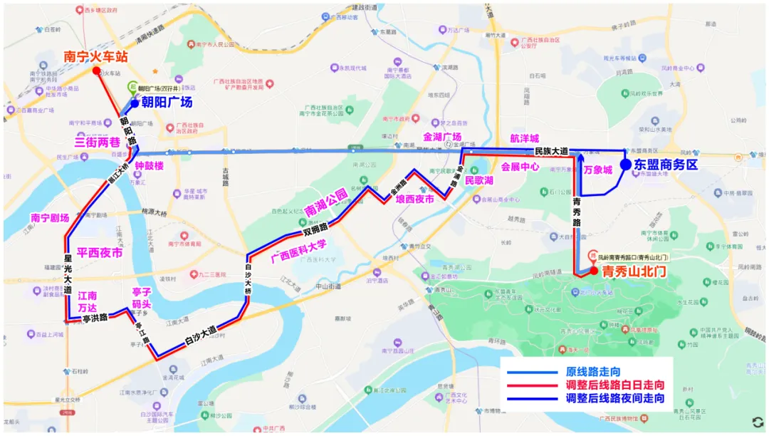 南宁火车站(朝阳华东路口)、朝阳广场(三街两巷)、邕江桥南(南宁剧场)、星光淡村路口(西园转盘)、星光平西路口(平西夜市)、星光福建路口(福建园)、亭洪星光路口(江南万达)[下行:星光亭洪路口(江南万达)]、亭洪亭江路口(亭子)、亭江亭洪路口(亭子码头)、白沙市场、医科大学、双拥青山路口、南湖广场、金洲桂春路口(埌西夜市)、民族金浦路口(民歌湖)[下行:民歌湖]、民族会展路口(会展中心)、石门森林公园(北面)、青秀民族路口(万象城)、青秀凤岭南路口(东面)、凤岭南桂花路口(广西自然资源博物馆)[北面]、凤岭南路青秀口(青秀山北门)