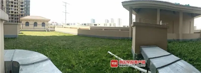 ▲小区外围一圈商铺的楼顶上直接种草皮。南国早报记者 赵敏摄于5月8日上午