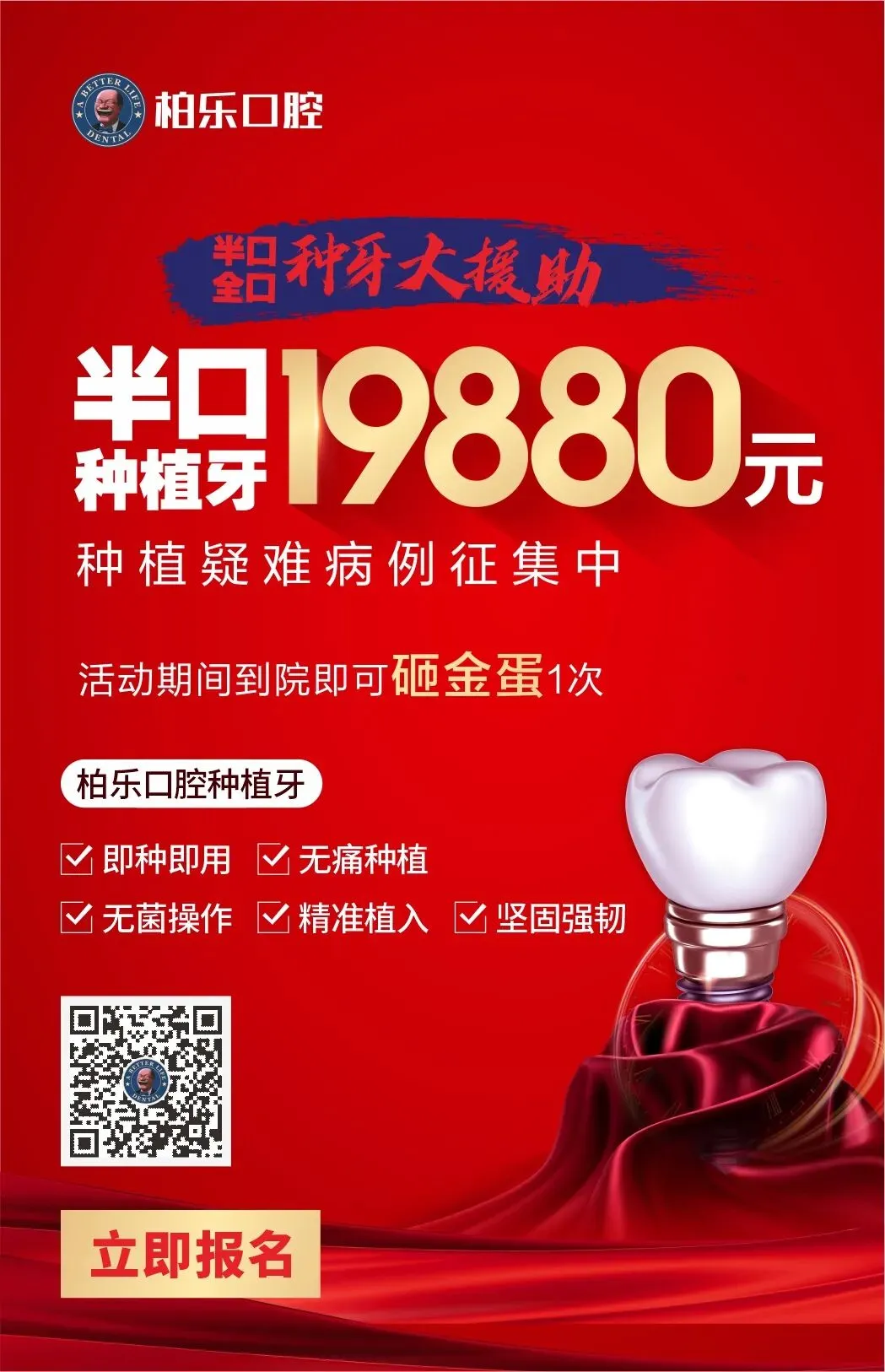 数据显示,我国65-80岁老年人中大约每10位老人就有1位多颗缺牙,基于为更多种植牙患者提供更优质的医疗技术服务及优惠政策,柏乐口腔特别策划全口半口种牙大援助活动,活动期间开放19880元半口种植抢购名额,现在报名或为家人报名还可领取口腔护理套装1份!