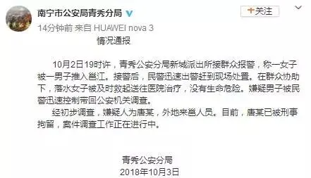 据警方通报,10月2日19时许,青秀公安分局新城派出所接群众报警,称一女子被一男子推入邕江。接警后,民警迅速出警赶到现场处置。在群众协助下,落水女子被及时救起送往医院治疗,没有生命危险。嫌疑男子被民警迅速控制带回公安机关调查。