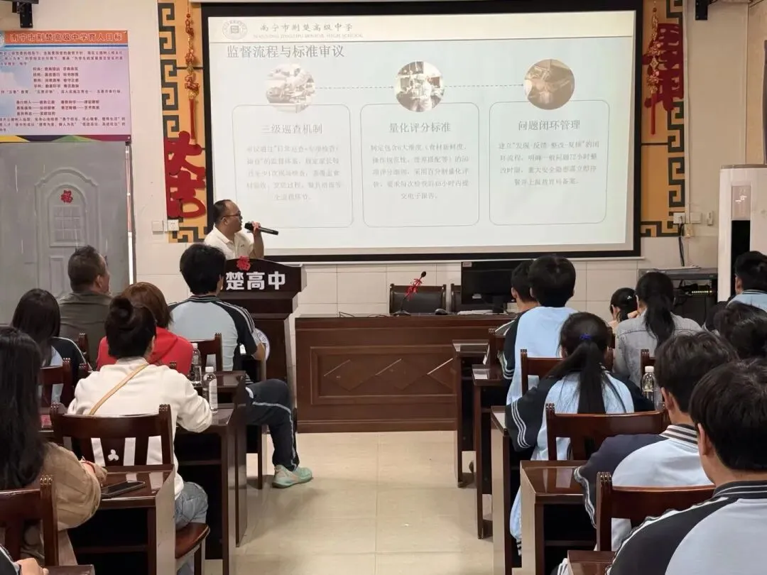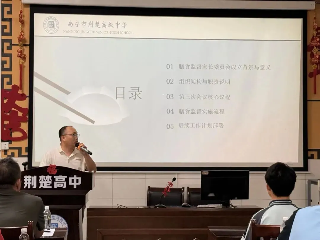 一餐一饭皆用心,一朝一夕总关情。校园膳食事关每一位学子的健康成长,更是家校协同育人的重要纽带。为进一步强化学校食堂规范化管理,优化膳食营养结构,牢牢守住学生饮食安全底线,搭建家校沟通的暖心桥梁,近日,南宁市荆楚高级中学顺利召开膳食监督家长委员会,家长代表、学校相关负责人齐聚一堂,共话膳食改善,共护学子舌尖健康。