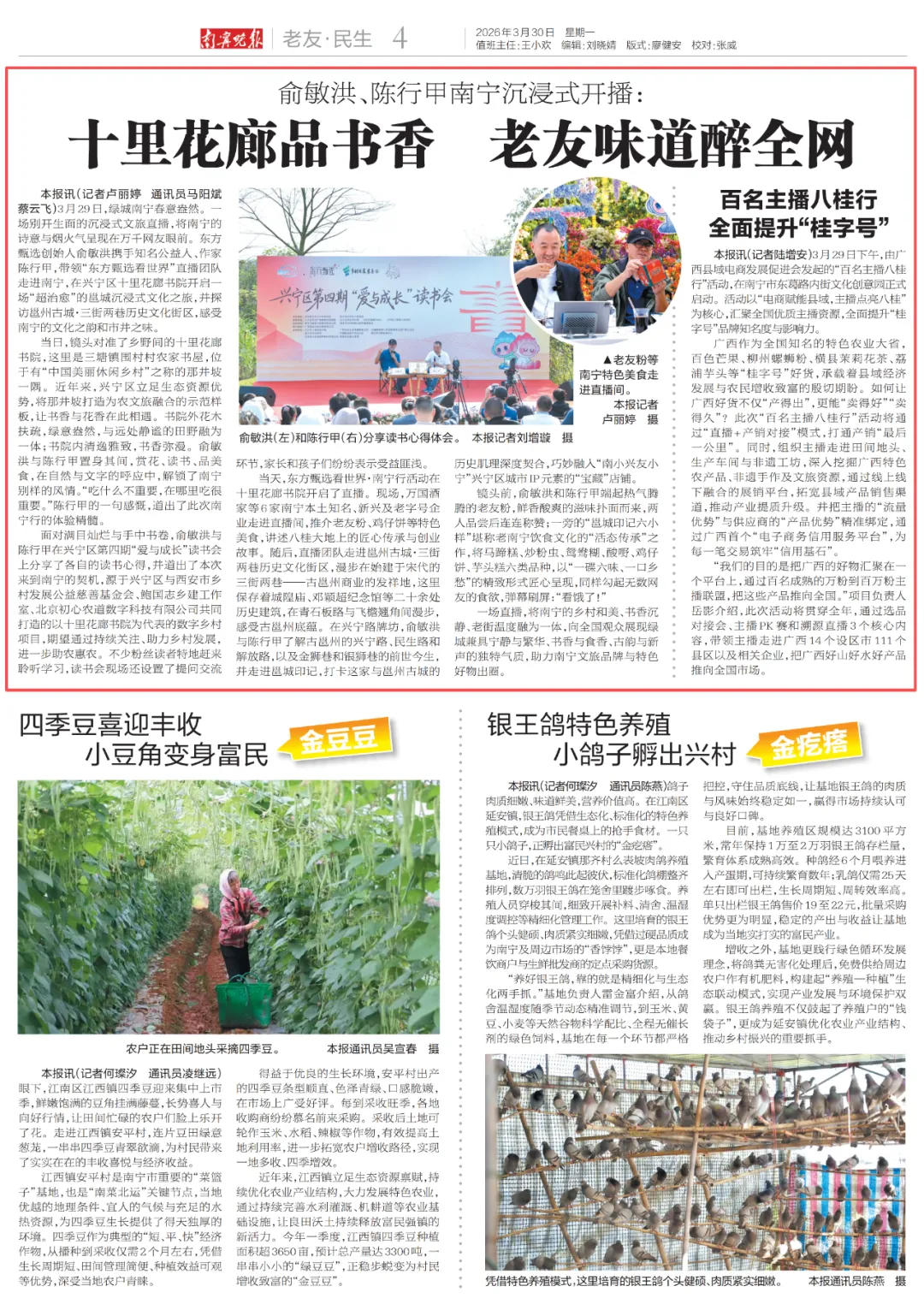 当日,镜头对准了乡野间的十里花廊书院,这里是三塘镇围村村农家书屋,位于有“中国美丽休闲乡村”之称的那井坡一隅。近年来,兴宁区立足生态资源优势,将那井坡打造为农文旅融合的示范样板,让书香与花香在此相遇。书院外花木扶疏,绿意盎然,与远处静谧的田野融为一体;书院内清逸雅致,书香弥漫。俞敏洪与陈行甲置身其间,赏花、读书、品美食,在自然与文字的呼应中,解锁了南宁别样的风情。“吃什么不重要,在哪里吃很重要。”陈行甲的一句感慨,道出了此次南宁行的体验精髓。