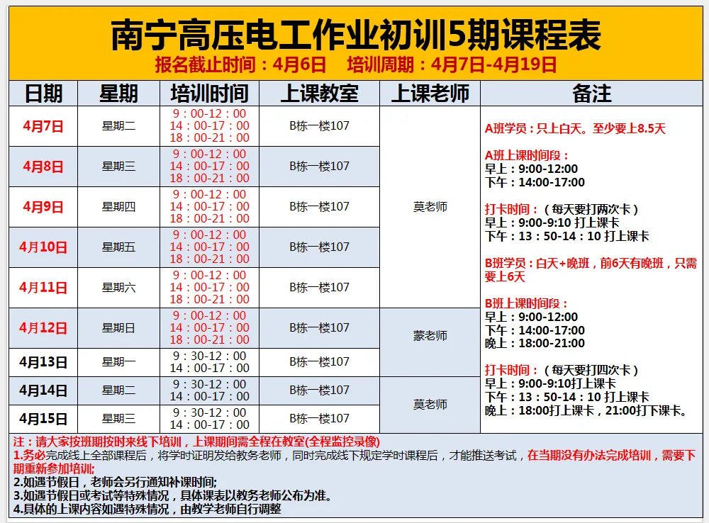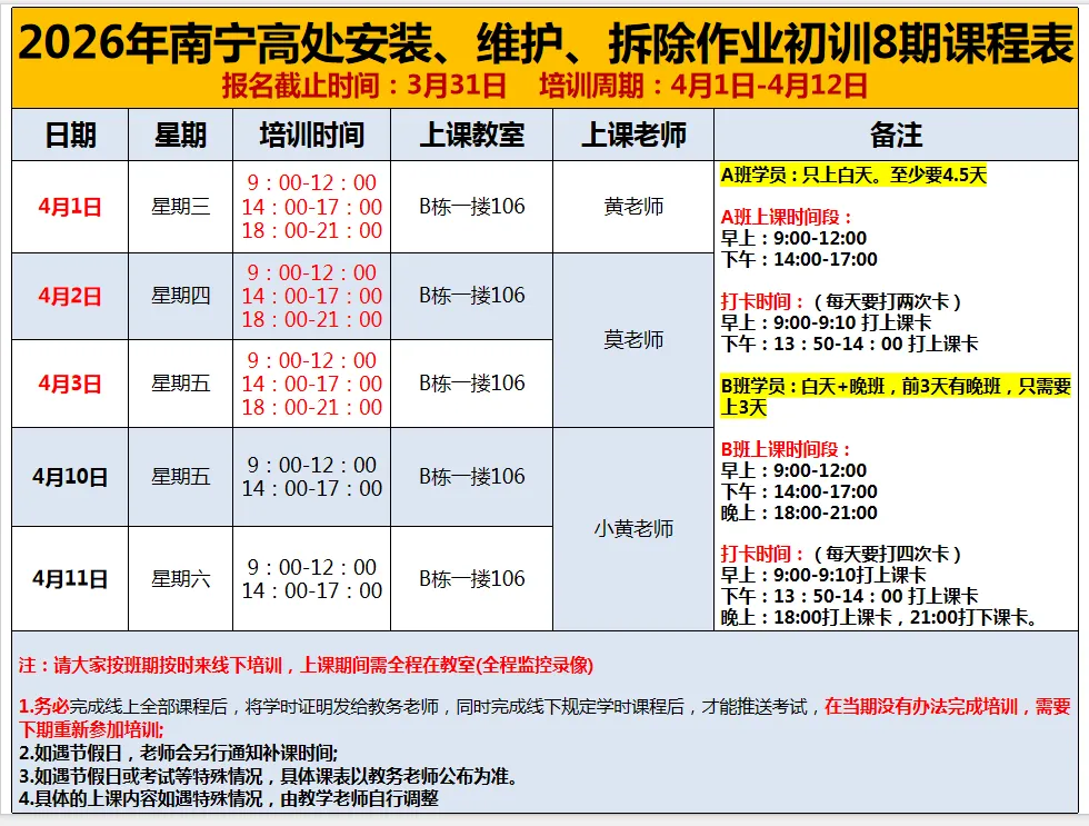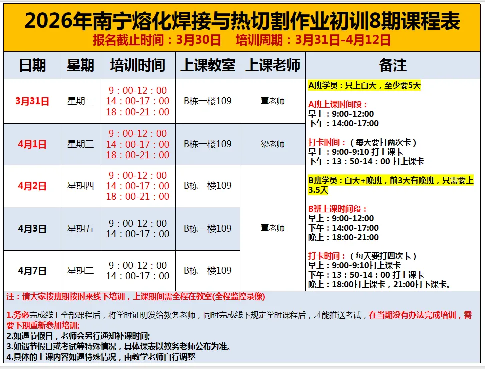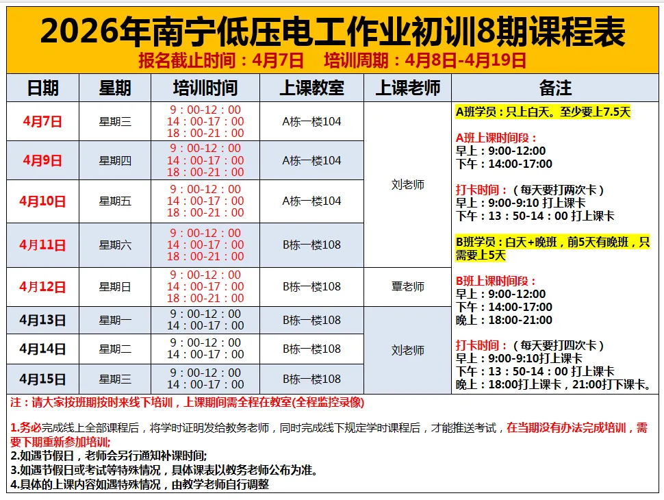 为了全面贯彻落实《中华人民共和国安全生产法》《特种作业人员安全技术培训考核办法》等文件规定,“特种作业人员当按照国家有关规定取得相应资格证书,方可从事相关工作”。为满足企业及社会作业人员的需要,南宁市于2026年4月举办《低压电工作业》《高压电工作业》《高处安装、维护、拆除作业》《熔化焊接与热切割作业》等特种作业人员培训班,现将有关事项通知如下:考试科目:考试分为理论+实操考试,理论(线上)+技能(线下)(复审学员只需参加理论考试)