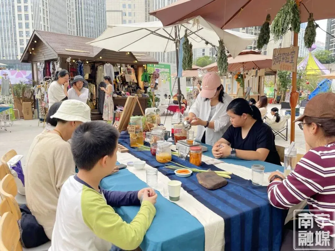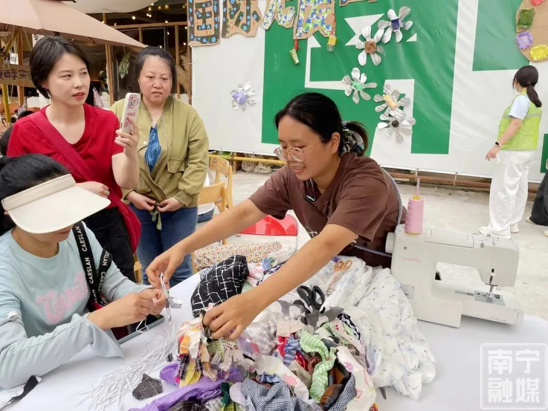 摒弃枯燥的理论宣讲,绿洲村里设置了十余个不同主题的体验点,打造出“可逛、可做、可换”的轻松体验动线,让市民从被动聆听者变为主动参与者,沉浸式感受无废生活的乐趣。在“旧袋新生”体验区,针线穿梭间,普通的旧布袋变成了独一无二的个性潮品,学生张景遥拿着自己的手作作品满心欢喜:“以后我要带着它出门,减少一次性塑料袋的使用。”“废料重生记”体验点果香四溢,工作人员手把手指导市民将菠萝皮、橙子皮等厨余垃圾与红糖、水混合制作环保酵素,带着孩子一同体验的罗女士感慨:“原来这些厨余垃圾放对地方就是资源,一个月后就能变成清洁剂,这让孩子和我对‘废物’有了全新的认识。”二手交换市集里,书籍、玩具、小摆设等闲置物品在这里寻找新主人,一场以物换物的交流,让物品的生命得以延续;“袋袋相传”塑料袋循环点、“二手书漂流”阅读角等特色环节,更是将“物尽其用”的无废智慧传递到每一个参与者心中。