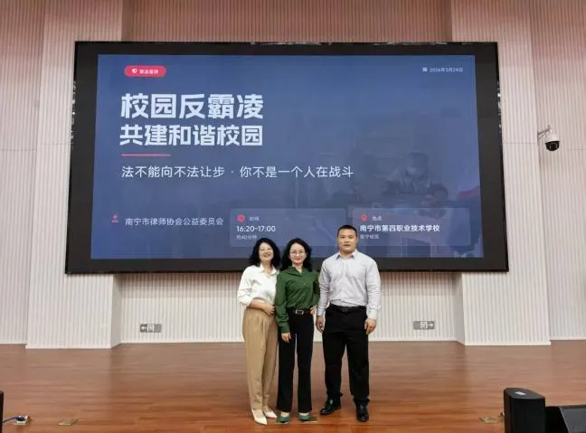 3月24日,南宁市律师协会在南宁第四职业技术学校开展“校园反霸凌,共建和谐校园”公益普法活动,联合学校多方联动,为青少年健康成长保驾护航。