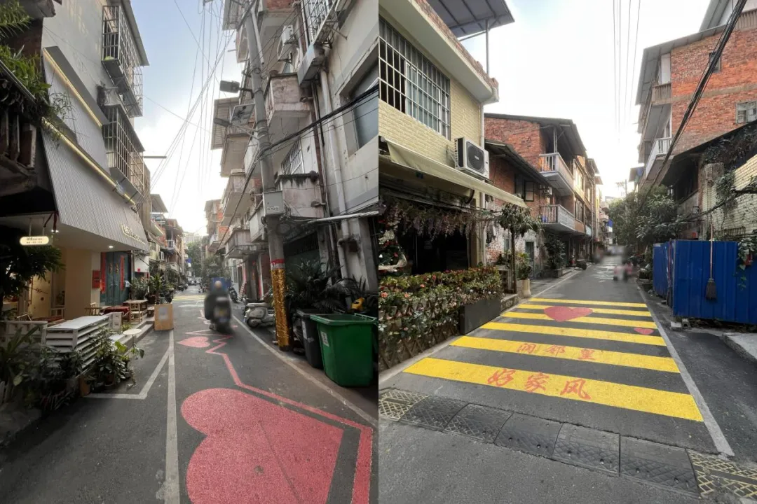 路面上多了些彩绘图案或文字,多用红、黄等明亮的颜色,与老街的陈旧气息形成了强烈的对比。