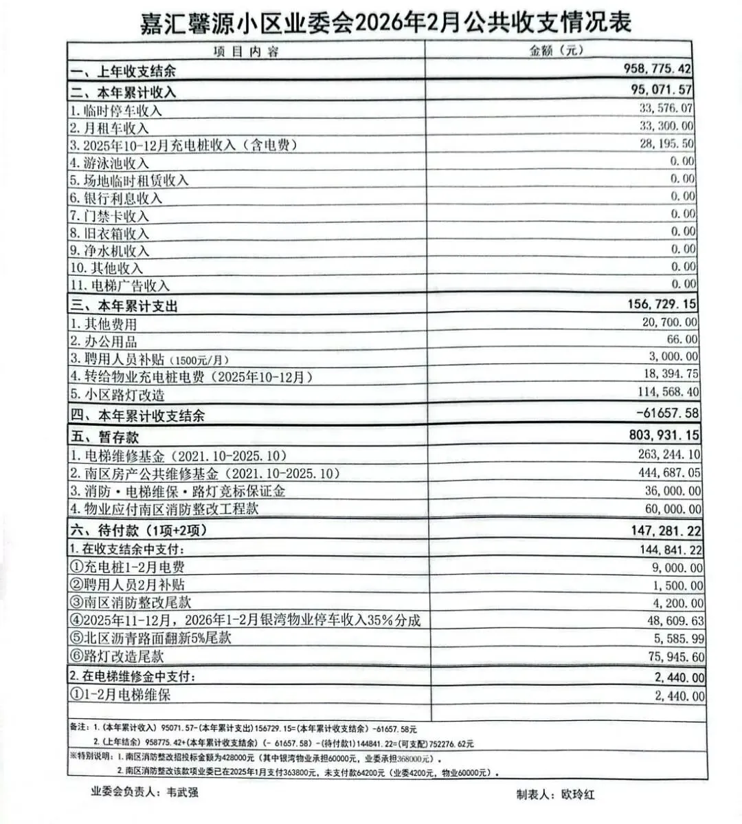 (一)截止2026年2月28日,小区公共收支可支配款累计为752276.62元,详见下表: